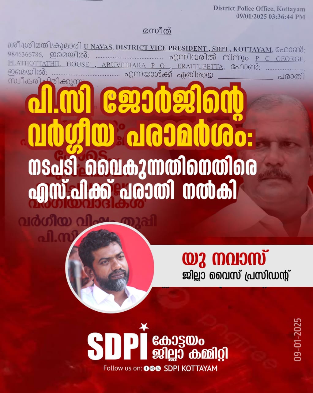 പി.സി ജോർജ് നടത്തിയ വർഗീയ പരാമർശത്തിൽ പരാതി നൽകിയിട്ടും കേസെടുക്കാത്തതിനെതിരെ ജില്ലാ പോലീസ് മേധാവിക്ക് എസ്ഡിപിഐ പരാതി നൽകി.