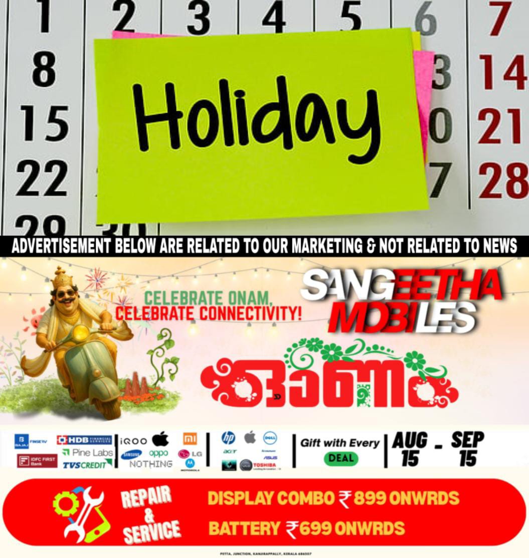 സെപ്റ്റംബര് 5- വെള്ളിയാഴ്ച- തിരുവോണം, നബി ദിനം- ഗുജറാത്ത്, മിസോറാം, മഹാരാഷ്ട്ര, കര്ണാടക, മധ്യപ്രദേശ്, തമിഴ്നാട്, ഉത്തരാഖണ്ഡ്, ആന്ധ്രാപ്രദേശ്, മണിപ്പൂര്, ജമ്മു കശ്മീര്, ഉത്തര് പ്രദേശ്, കേരളം, ഡല്ഹി, ഝാര്ഖണ്ഡ്, തെലങ്കാന
