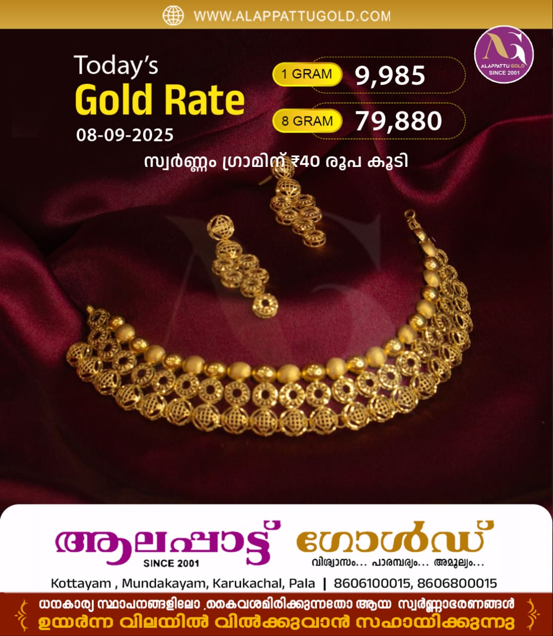 ഇന്ന് രാവിലെ സ്വർണ്ണവില നിശ്ചയിക്കുമ്പോൾ അന്താരാഷ്ട്ര സ്വർണ്ണവില 3584 ഡോളറിലും, രൂപയുടെ വിനിമയ നിരക്ക് 88.21 ആയിരുന്നു. ഉച്ചയ്ക്ക് ശേഷം അന്താരാഷ്ട്ര സ്വർണ്ണവില 3612 ഡോളറിലേക്ക് എത്തിയതും രൂപയുടെ വിനിമയ നിരക്ക് 88 ലേക്കും എത്തിയതിനെ തുടർന്ന് സ്വർണ്ണവില 50 രൂപ വർദ്ധിച്ച് 9985 രൂപ ഗ്രാമിനും, 400 രൂപ വർദ്ധിച്ച് 79880 രൂപ പവനും വിലയായി.കഴിഞ്ഞ മാസം 22ന് 9215 രൂപയായിരുന്നു ഒരു ഗ്രാം സ്വർണത്തിന് വില 17 ദിവസത്തിനുള്ളിൽ വില 9985 രൂപയിലേക്ക് എത്തിയിരിക്കുകയാണ്. സ്വർണ്ണവില ഗ്രാമിന് പതിനായിരം രൂപയിലേക്ക് എത്താൻ ഇനി 15 രൂപ മാത്രമാണ്.