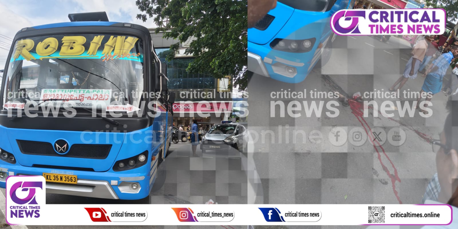 ബുധനാഴ്ച വൈകുന്നേരം 4 മണിയോടെയാണ് സംഭവം. കാഞ്ഞിരപ്പള്ളി ഈരാറ്റുപേട്ട റൂട്ടിൽ സർവീസ് നടത്തുന്ന റോബിൻ ബസ് ഇടിച്ചാണ് കാഞ്ഞിരപ്പള്ളി ടൗൺ പള്ളിക്ക് സമീപം വ്യാപാരം നടത്തുന്ന ഹക്കീമിന് (67) പരിക്കേറ്റത്.