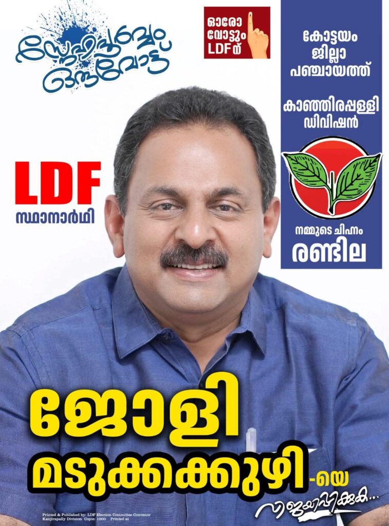 പത്തു വർഷമായി ബ്ലോക്ക് പഞ്ചായത്ത് അംഗമായ ജോളി മടുക്കകുഴി കേരള കോൺഗ്രസ് (എം) സംസ്ഥാന സമിതി അംഗമാണ്.