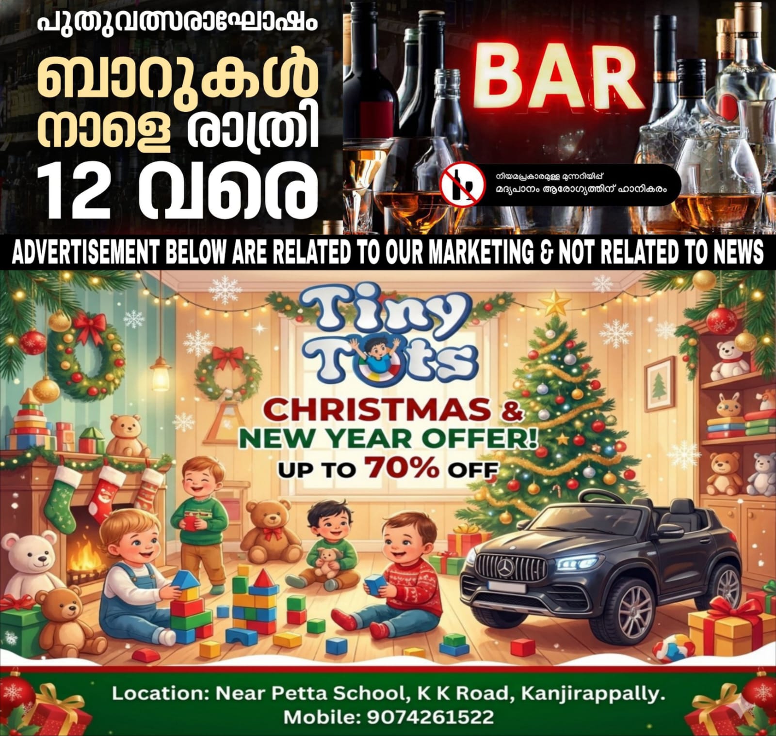 വിനോദസഞ്ചാരികളുടെ വരവ് കണക്കിലെടുത്താണ് തീരുമാനം. സംസ്ഥാനത്ത് ആദ്യമായാണ് പുതുവത്സരാഘോഷങ്ങള്ക്കായി ബാറുകളുടെ പ്രവര്ത്തന സമയം ദീര്ഘിപ്പിക്കുന്നത്. എന്നാല് ബെവ്കോ ഔട്ടലെറ്റുകളുടെ പ്രവര്ത്തന സമയത്തില് മാറ്റമില്ല. ഒന്പതു മണി വരെയാകും ഔട്ട് ലെറ്റുകള് പ്രവര്ത്തിക്കുക.