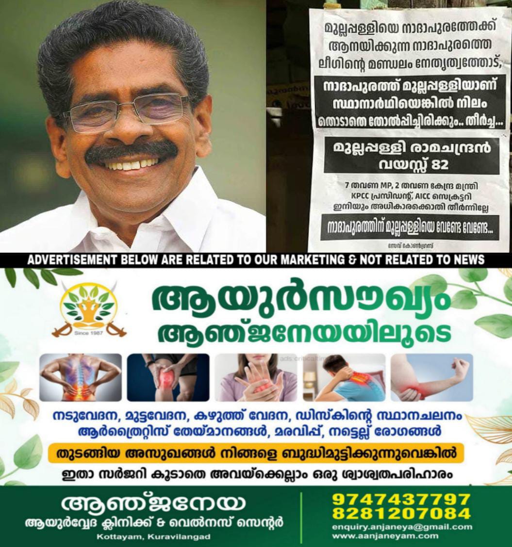 കോഴിക്കോട് ജില്ലയിലെ നാദാപുരം, കൊയിലാണ്ടി മണ്ഡലങ്ങളില് ഏതിലെങ്കിലും മത്സരിക്കാന് മുല്ലപ്പള്ളി രാമചന്ദ്രന് നീക്കം നടത്തുന്നുണ്ടെന്ന വാര്ത്ത പ്രചരിക്കുന്നതിനിടെയാണ് പോസ്റ്ററുകള് പ്രത്യക്ഷപ്പെട്ടത്. തെരഞ്ഞെടുപ്പില് യുവാക്കള്ക്കൊപ്പം മുതിര്ന്നവര്ക്കും അര്ഹമായ പരിഗണന നല്കണമെന്ന് മുല്ലപ്പള്ളി ആവശ്യപ്പെട്ടിരുന്നു.