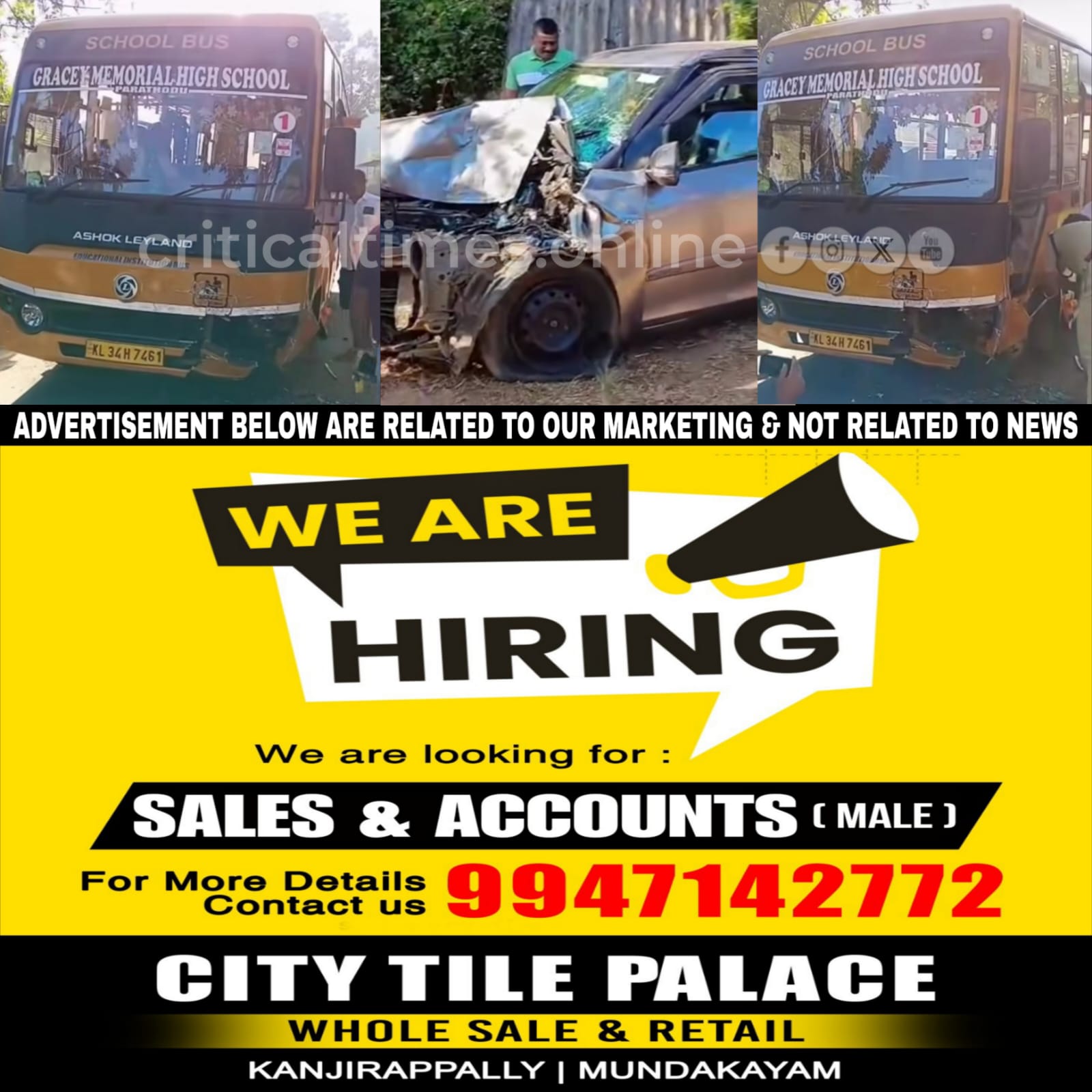 കാഞ്ഞിരപ്പള്ളി: കോട്ടയം കുമളി ദേശീയപാതയിൽ കാഞ്ഞിരപ്പള്ളി ഇടച്ചോറ്റിയിൽ സ്വകാര്യ സ്കൂൾ ബസ്സും കാറും കൂട്ടിയിടിച്ച് അപകടം. പാറത്തോട് ഗ്രേസി മെമ്മോറിയൽ സ്കൂളിന്റെ ബസ് ആണ് അപകടത്തിൽ പെട്ടത്.