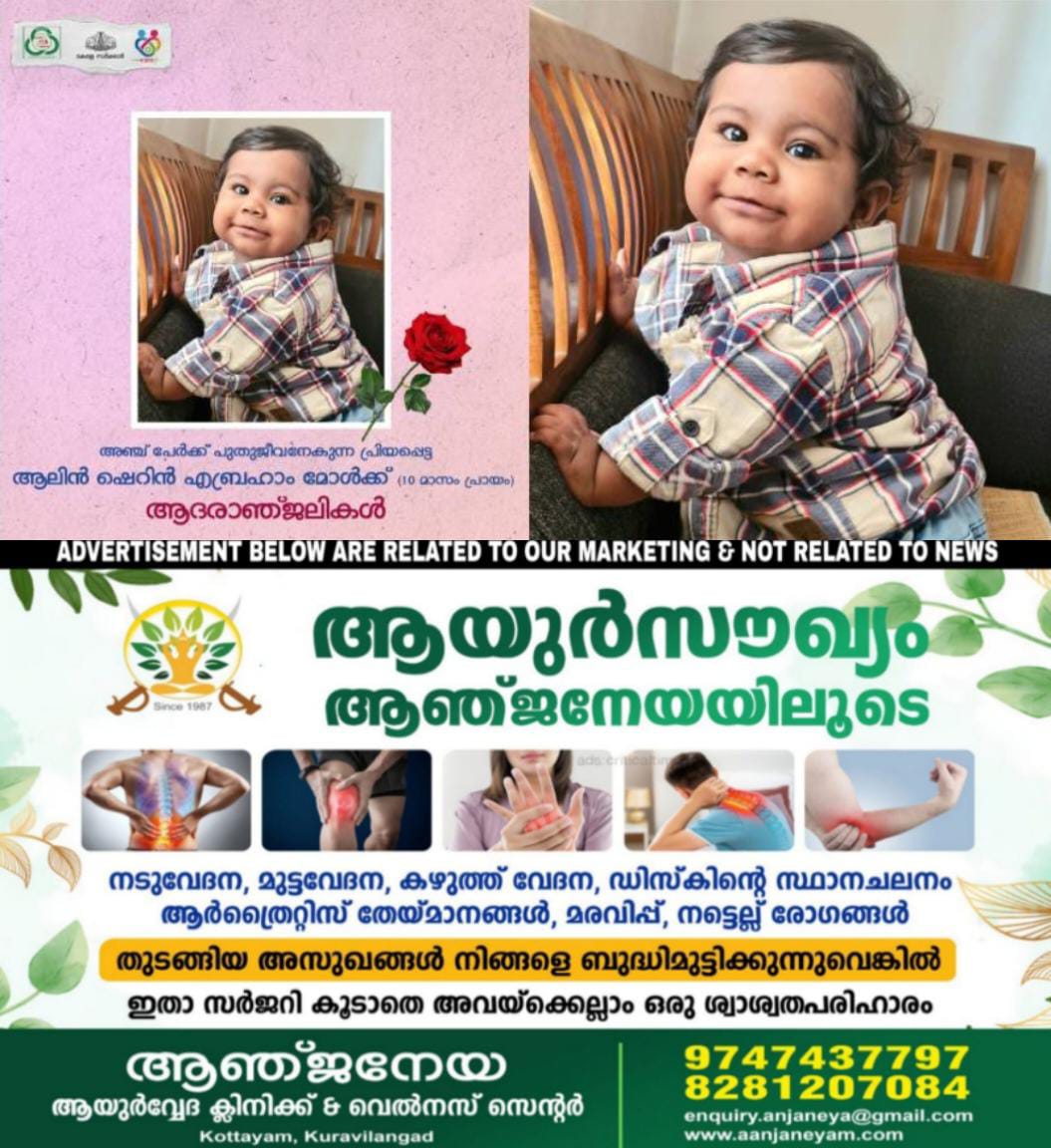 റോഡപകടത്തില് പരിക്കേറ്റ് മസ്തിഷ്ക മരണം സംഭവിച്ച പത്ത് മാസം പ്രായമായ കുഞ്ഞിന്റെ അവയവങ്ങള് ദാനം ചെയ്തു. പത്തനംതിട്ട മല്ലപ്പള്ളി സ്വദേശികളുടെ 10 മാസം പ്രായമുള്ള ആലിന് ഷെറിന് എബ്രഹാമിന്റെ അവയവങ്ങളാണ് ദാനം ചെയ്തത്. അവയവദാനത്തിന് രക്ഷിതാക്കള് സന്നദ്ധത അറിയിച്ചതോടെ സംസ്ഥാനത്ത ഏറ്റവും പ്രായം കുറഞ്ഞ അവയവദാതാവായും ആലിന് ഷെറിന് എബ്രഹാം മാറി.