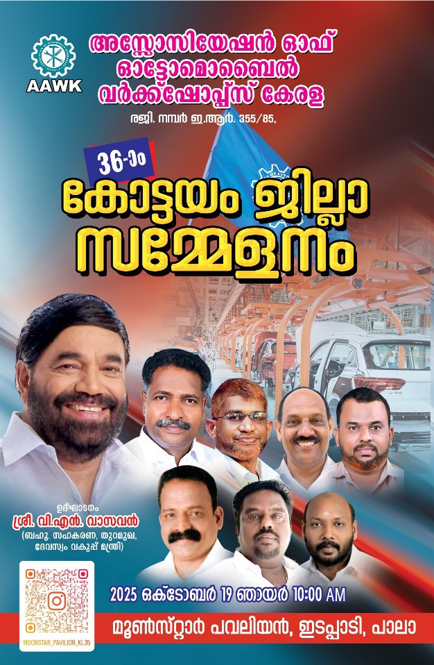 കോട്ടയം: അസോസിയേഷൻ ഓഫ് ഓട്ടോമൊബൈൽ വർഷോപ്പ്സ് കേരള 36-മത് കോട്ടയം ജില്ലാ സമ്മേളനം പാലായിൽ നടക്കും. നാളെ രാവിലെ 10 മണിക്ക് പാലാ ഇടപ്പാടി മൂൺസ്റ്റാർ പവലിയനിൽ AAWK കോട്ടയം ജില്ലാ പ്രസിഡന്റ് എ.ആർ രാജന്റെ അധ്യക്ഷതയിൽ നടത്തപെടുന്ന പരുപാടി സഹകരണ, തുറമുഖ, ദേവസ്യം വകുപ്പ് മന്ത്രി ശ്രീ വി.എൻ. വാസവൻ ഉദ്ഘാടനം ചെയ്യും.