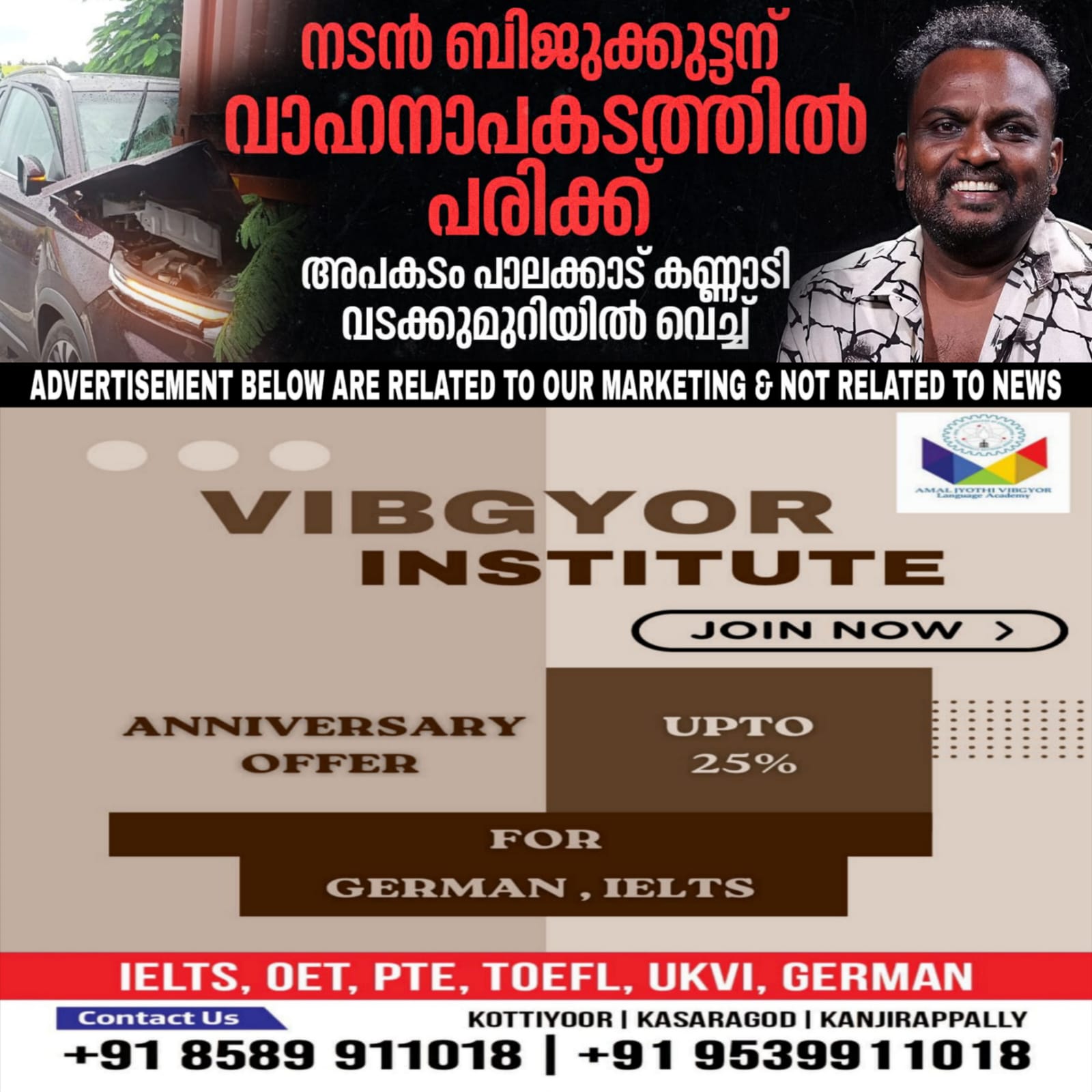 നടന് ബിജുക്കുട്ടന് വാഹനാപകടത്തില് പരിക്കേറ്റു. പാലക്കാട് കണ്ണാടി വടക്കുമുറിയില് വച്ചാണ് അപകടമുണ്ടായത്. പുലര്ച്ചെ ആറ് മണിയോടെയാണ് സംഭവം.