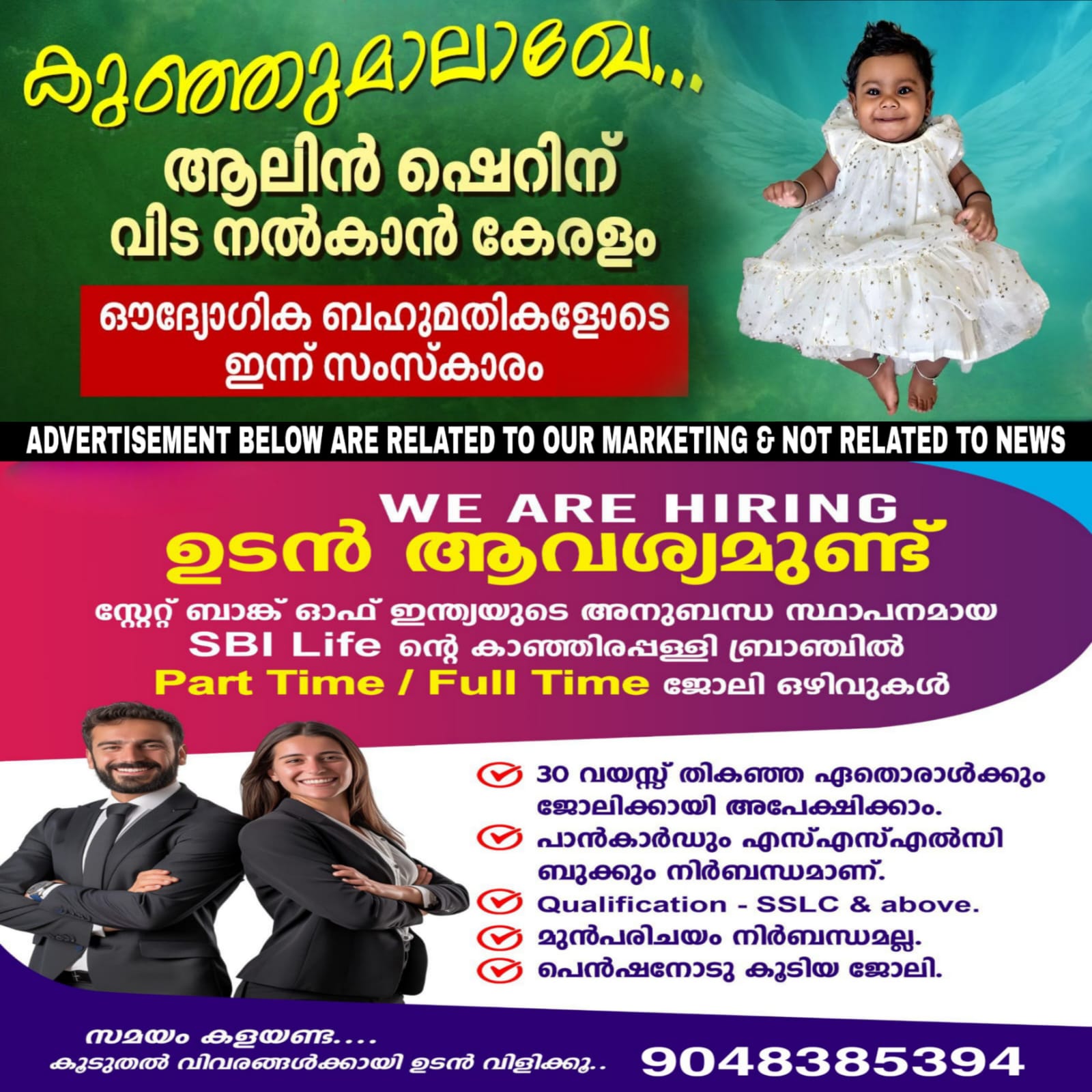 സംസ്ഥാനത്തെ പ്രായം കുറഞ്ഞ അവയവദാതാവായ പത്ത് മാസം പ്രായമുള്ള ആലിന് ഷെറിന് എബ്രഹാമിന്റെ സംസ്കാരം ഇന്ന്. പത്തനംതിട്ട മല്ലപ്പളളി നെടുങ്ങാടപ്പള്ളി സെന്റ് തോമസ് സിഎസ്ഐ പള്ളി സെമിത്തേരിയില് 3.30ന് സംസ്കാരം നടത്തും. മസ്തിഷ്ക മരണത്തിന് പിന്നാലെ അവയവങ്ങള് ദാനം ചെയ്ത ആലിന് ഷെറിന് സംസ്ഥാനം ഔദ്യോഗിക ബഹുമതികളോടെയാവും വിട നല്കുക. പോസ്റ്റുമോര്ട്ടത്തിന് ശേഷം കുഞ്ഞിന്റെ മൃതദേഹം മലപ്പള്ളിയിലെ സ്വകാര്യ ആശുപത്രിയിലേക്ക് മാറ്റിയിരുന്നു.
