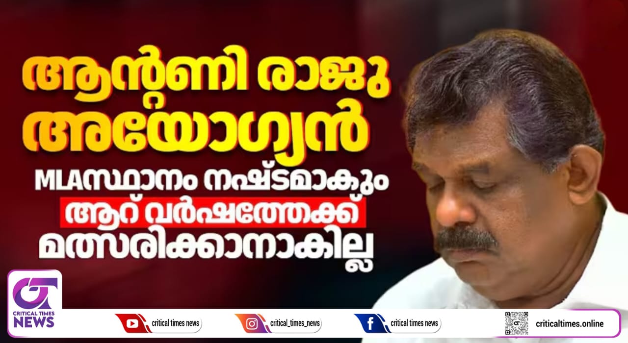 വരുന്ന തെരഞ്ഞെടുപ്പുകളിൽ മത്സരിക്കാനും കഴിയില്ല. മേൽ കോടതികളിലേക്ക് പോയി വിധിക്ക് സ്റ്റേ നേടിയാലും അയോഗ്യത നിലനിൽക്കുമെന്നതാണ് മറ്റൊരു കാര്യം. ലഹരിക്കേസിൽ വിദേശിയായ പ്രതിയെ രക്ഷിക്കാൻ തൊണ്ടിമുതൽ അട്ടിമറിച്ച കേസിലാണ് ആൻ്റണി രാജുവിന് തടവ് ശിക്ഷ ലഭിച്ചത്.