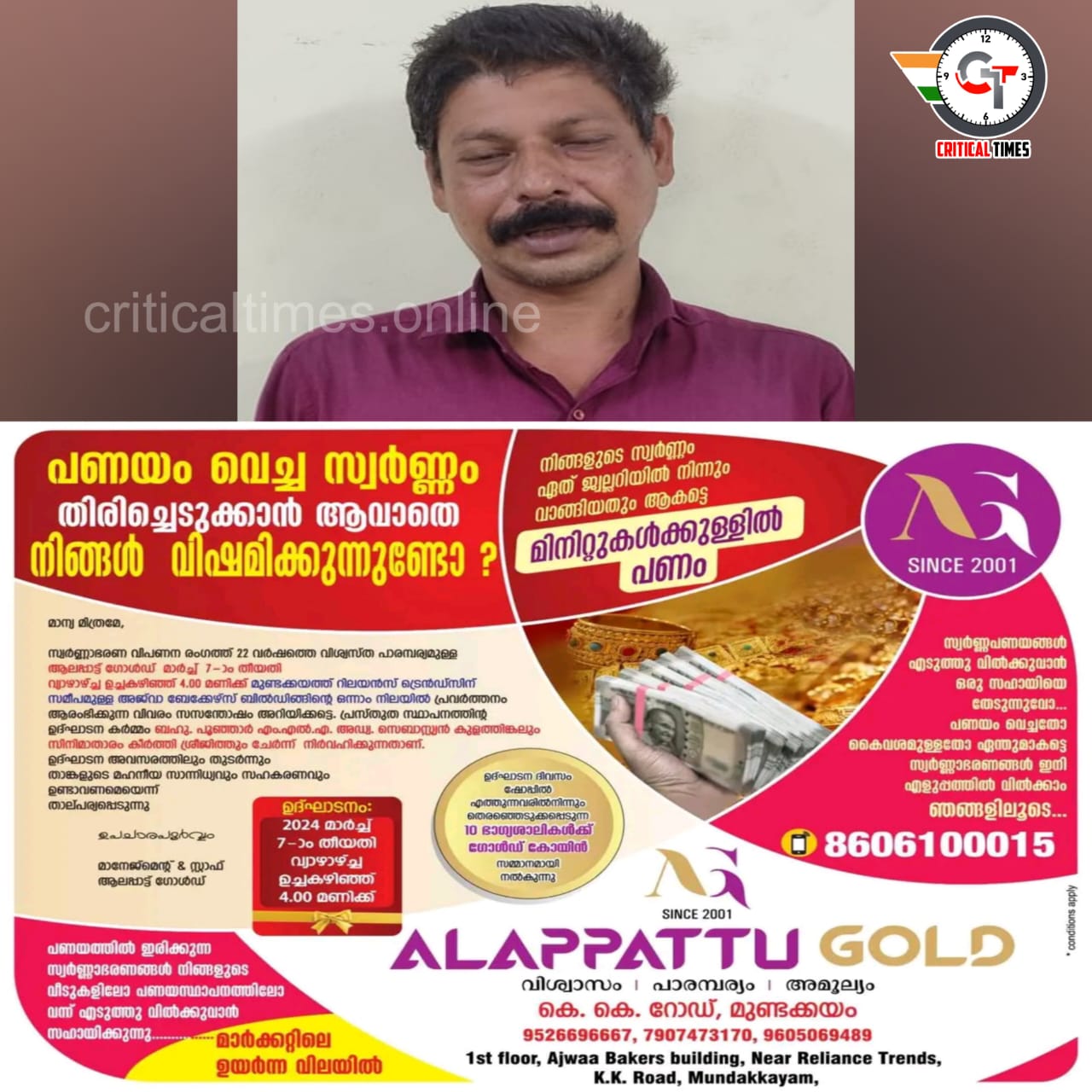 ഇയാൾ കഴിഞ്ഞ ദിവസം രാത്രി 8 മണിയോടുകൂടി എരുത്വാപ്പുഴ കവല ഭാഗത്ത് വെച്ച് എരുത്വാപ്പുഴ സ്വദേശിയായ യുവാവിനെ ആക്രമിക്കുകയായിരുന്നു. അജേഷിന് യുവാവിനോട് മുന്‍വൈരാഗ്യം നിലനിന്നിരുന്നു.