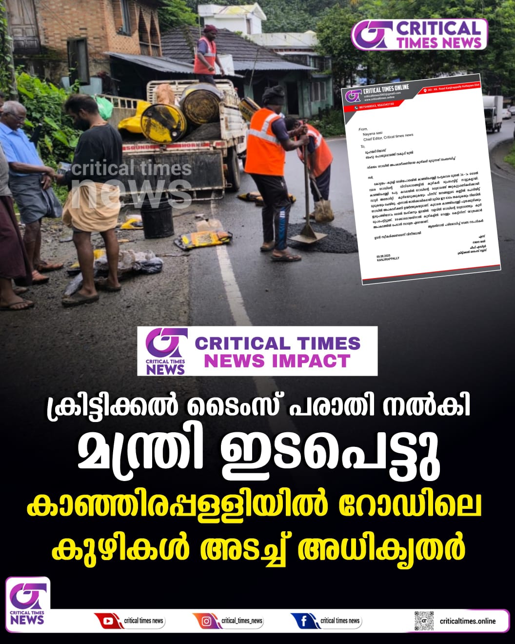 കാഞ്ഞിരപ്പള്ളി: കെ.കെ റോഡിൽ കാഞ്ഞിരപ്പള്ളി ടൗൺ മുതൽ 26 മൈൽ ജംഗ്ഷൻ വരെയുള്ള റോഡിലെ കുഴികൾ ഉടൻ അടയ്ക്കണം എന്ന് ആവശ്യപ്പെട്ട് ക്രിട്ടിക്കൽ ടൈംസ് ന്യൂസ് ചീഫ് എഡിറ്റർ നയന ശശി പൊതുമരാമത്ത് വകുപ്പ് മന്ത്രി മുഹമ്മദ് റിയാസിന് നൽകിയ പരാതിയിൽ അതിവേഗ നടപടി.