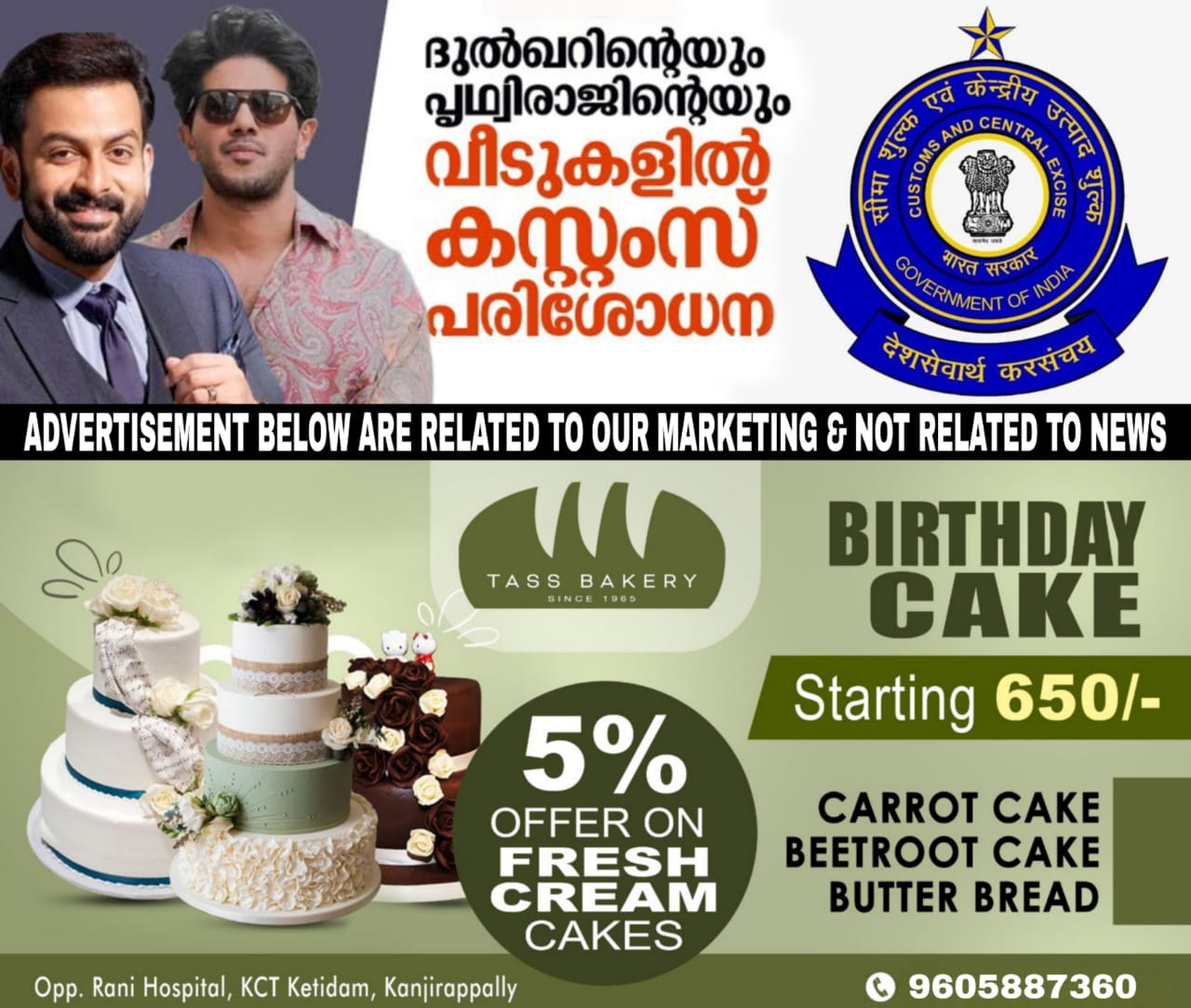മലയാള സിനിമാ നടന്മാരായ പൃഥ്വിരാജിന്റെയും ദുൽഖർ സൽമാന്റെയും വീടുകളിൽ കസ്റ്റംസിന്റെ നേതൃത്വത്തിൽ പരിശോധന. പൃഥ്വിരാജിന്റെ തേവരയിലുള്ള വീട്, ദുൽഖർ സൽമാന്റെ പനമ്പിള്ളി നഗറിലുള്ള വീട് എന്നിവിടങ്ങളിലാണ് പരിശോധന. കസ്റ്റംസിന്റെ നേതൃത്വത്തിൽ രാജ്യവ്യാപകമായി നടത്തുന്ന ഓപ്പറേഷൻ നുംകൂറിന്റെ ഭാഗമായാണ് നടപടി. ഭൂട്ടാൻ വഴി ആഡംബര കാറുകൾ നികുതിവെട്ടിച്ച് ഇന്ത്യയിൽ എത്തിക്കുന്നെന്ന കണ്ടെത്തലിനെ തുടർന്നാണ് രാജ്യവ്യാപകമായി കസ്റ്റംസ് റെയ്ഡ് നടത്തുന്നത്.