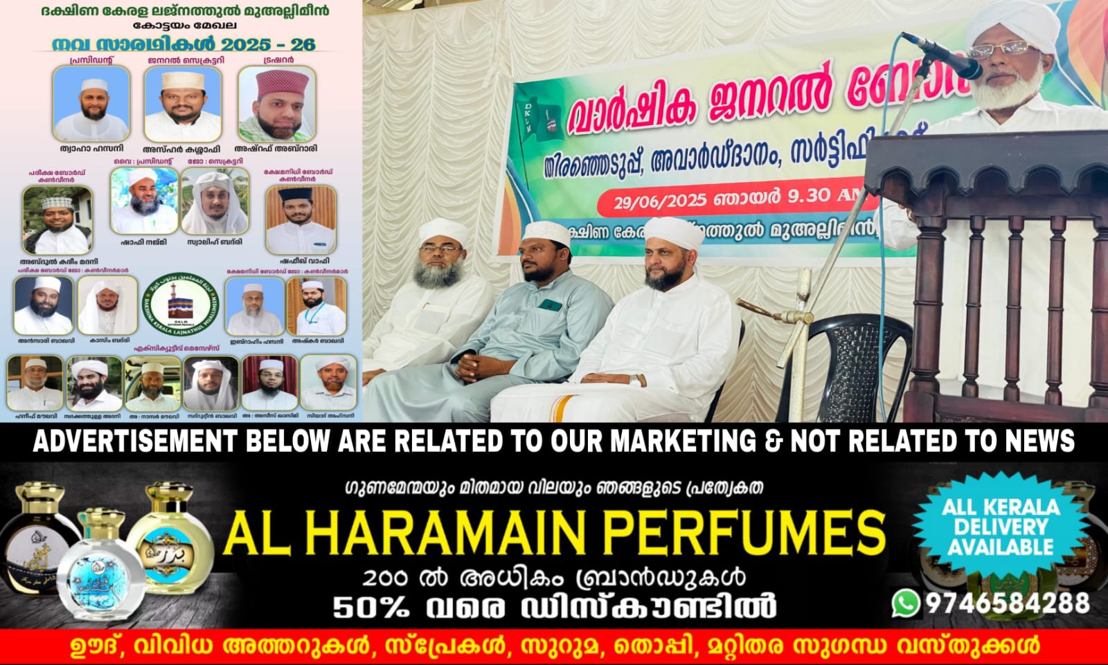 കോട്ടയം: ദക്ഷിണ കേരള ലജ്നത്തുൽ മുഅല്ലിമീൻ കോട്ടയം മേഖലയുടെ വാർഷിക ജനറൽ ബോഡിയും മെറിറ്റ് അവാർഡ് വിതരണവും സംഘടിപ്പിച്ചു. കുമ്മനം ജുമാമസ്ജിദ് മദ്റസ ഹാളിൽ നടന്ന യോഗം ഡി.കെ.ഐ.എം. വി ബോർഡ് സംസ്ഥാന സെക്രട്ടറി പാങ്ങോട് എ.ഖമറുദ്ദീൻ മൗലവി ഉദ്ഘാടനം ചെയ്തു.