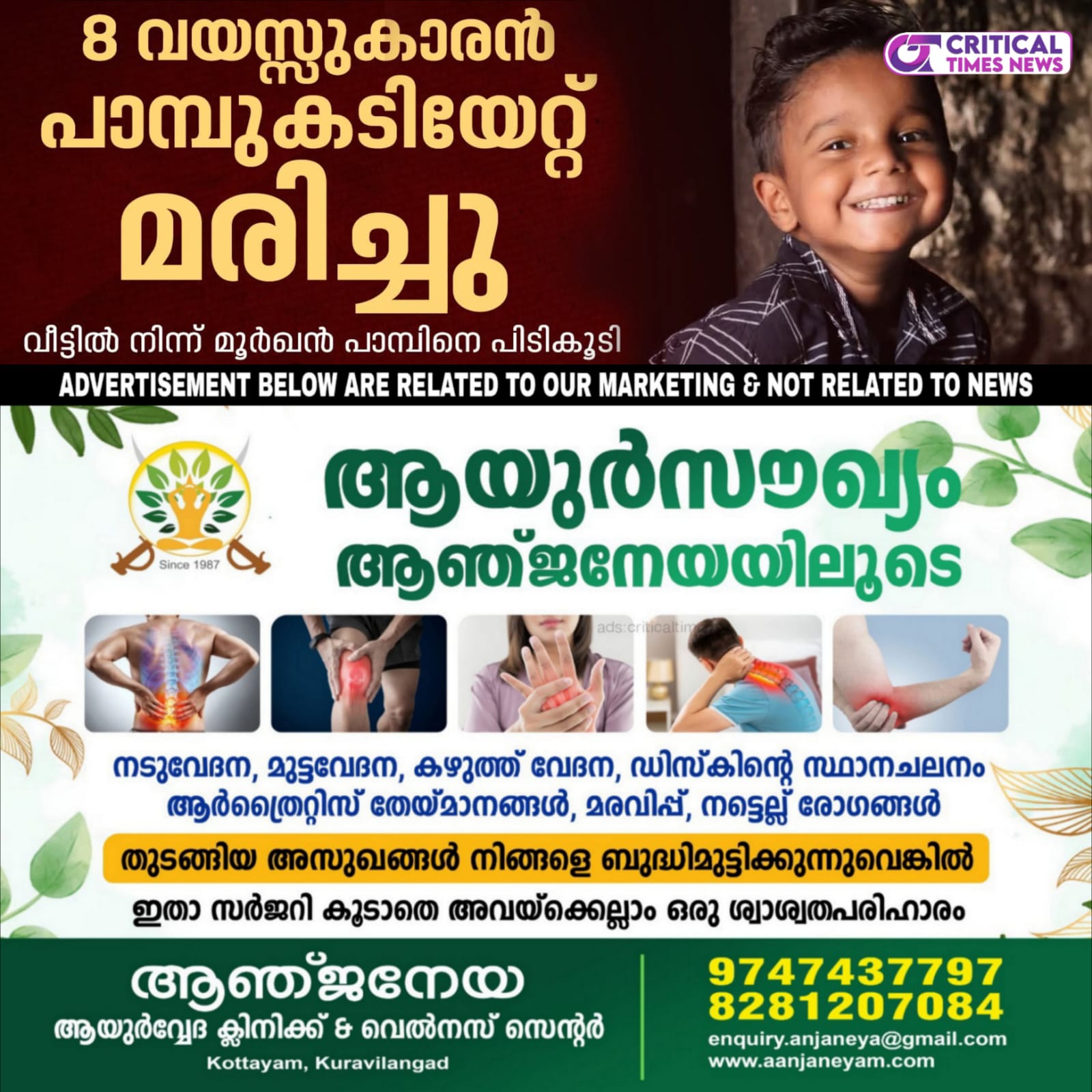 ഉടന് തന്നെ ചിറയിന്കീഴ് ആശുപത്രിയിലെത്തിച്ചു. പ്രാഥമിക ശുശ്രൂഷ നല്കിയശേഷം ഉടന് തന്നെ തിരുവനന്തപുരം മെഡിക്കല് കോളജില് എത്തിച്ചെങ്കിലും ജീവന് രക്ഷിക്കാനായില്ല. നാട്ടുകാർ വീട്ടിൽ നടത്തിയ തിരിച്ചിലിൽ കുട്ടി കിടന്ന മുറിയിൽ നിന്നും മൂർഖൻ പാമ്പിനെ കണ്ടെത്തി. തൃശൂരിൽ സഹോദരങ്ങൾക്ക് പാമ്പുകടിയേറ്റതിൽ ഒരു കുട്ടി മരിച്ചതിന്റെ നൊമ്പരം മാറും മുമ്പാണ് മറ്റൊരു കുട്ടിയുടെ മരണം കൂടി ഉണ്ടായിരിക്കുന്നത്.