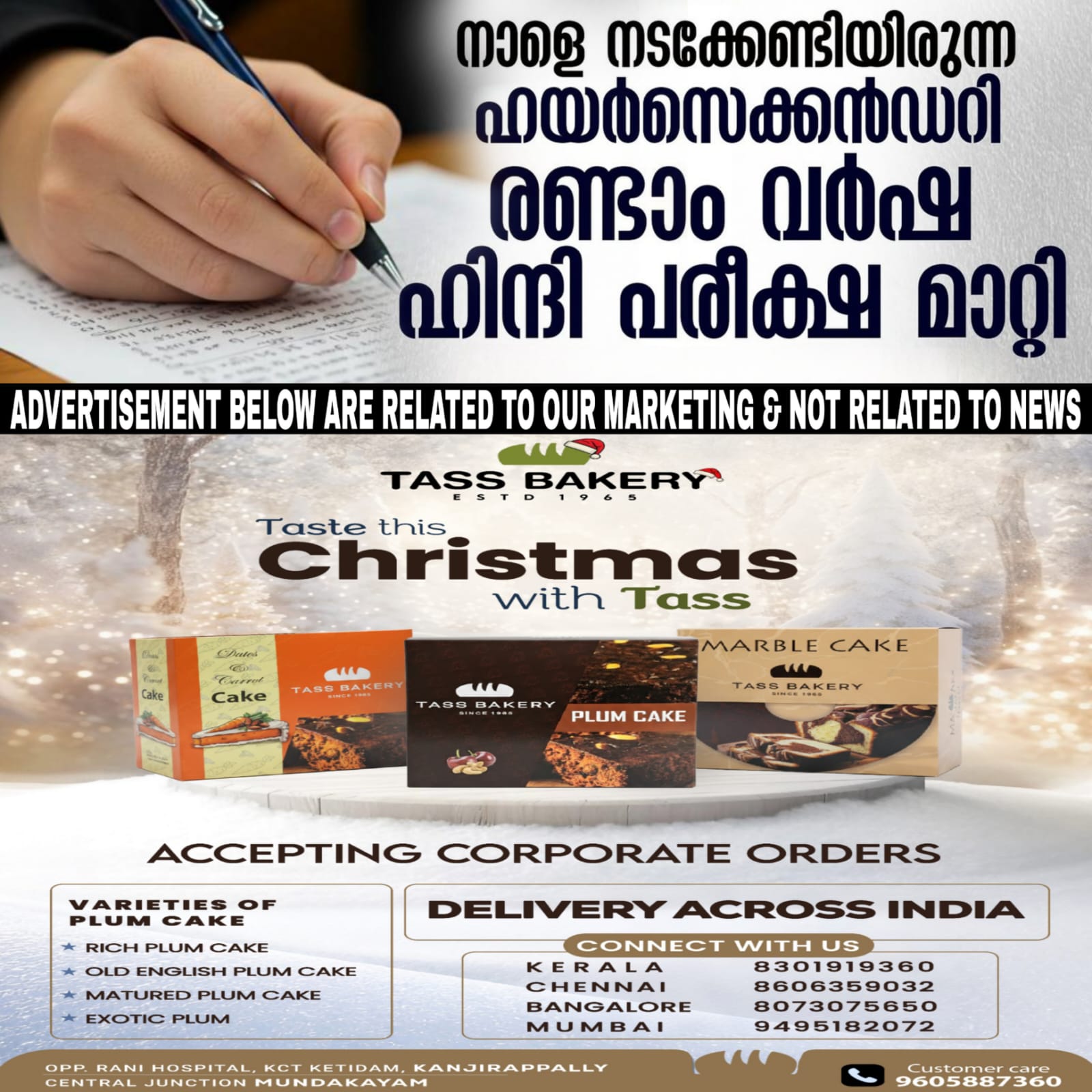 രണ്ടാം പാദ വാർഷിക പരീക്ഷയുടെ ഭാഗമായി നാളെ നടത്താനിരുന്ന ഹയർ സെക്കന്ററി ഹിന്ദി പരീക്ഷ മാറ്റി. മാറ്റിവച്ച പരീക്ഷ ക്രിസ്തുമസ് അവധി കഴിഞ്ഞ് ജനുവരി 5 ന് നടത്തും. പൊതുവിദ്യാഭ്യാസ വകുപ്പിന്റെ ഹയർ സെക്കന്ററി പരീക്ഷാ വിഭാഗം അറിയിച്ചതാണിത്. ചില സാങ്കേതിക കാരണങ്ങളാൽ പരീക്ഷ മാറ്റിവയ്ക്കുന്നു എന്നാണ് അറിയിപ്പ്. ചോദ്യപേപ്പർ മാറി പൊട്ടിച്ചത് ആണ് കാരണം എന്നാണ് സൂചന.