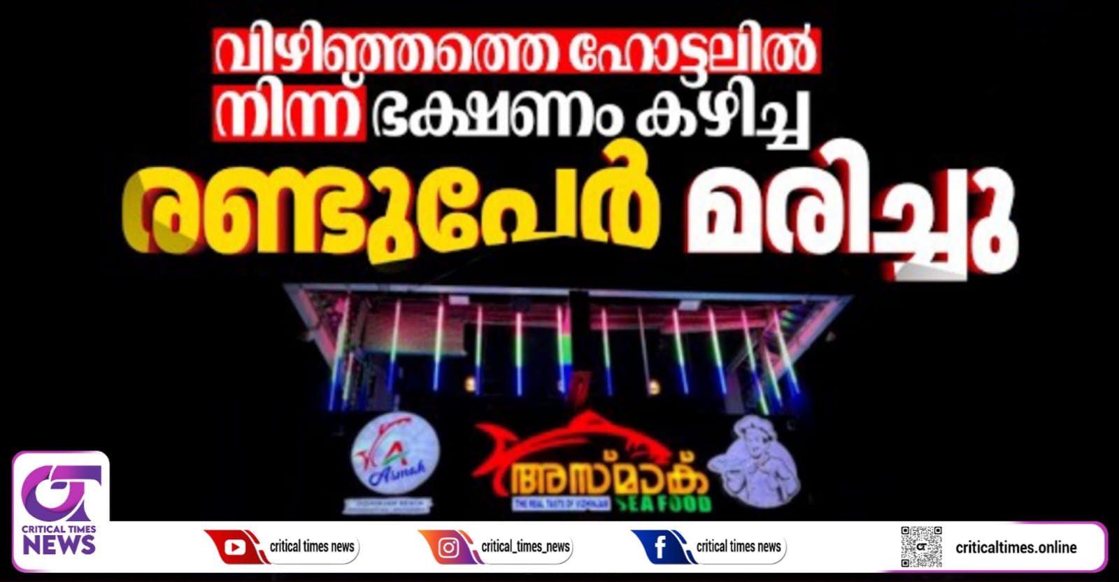 വിഴിഞ്ഞത്തെ ഹോട്ടലില് നിന്ന് ഭക്ഷണം കഴിച്ചവര്ക്ക് ഭക്ഷ്യവിഷബാധയേറ്റു. രണ്ട് പേര് മരിച്ചു. നിലമേല് സ്വദേശികളായ റഷീദ ബീവി, ഷാജി എന്നിവരാണ് മരിച്ചത്. വിഴിഞ്ഞം അസ്മാര്ക്ക് ഹോട്ടലില് നിന്നാണ് ഇവര് ഭക്ഷണം കഴിച്ചത്.