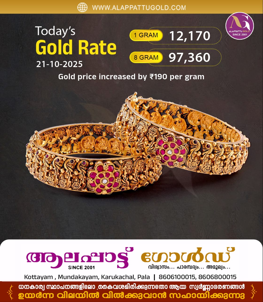 സ്വർണവില വീണ്ടും റെക്കോർഡിൽ. പവന് 1,520 രൂപ കൂടി 97,360 രൂപയാണ് ഇന്നത്തെ വില. ഗ്രാമിന് 190 രൂപ കൂടി 12,170 രൂപയായി. രണ്ട് ദിവസമായി തുടർന്ന ഇടിവിന് ശേഷമാണ് ഈ വർധനവ്.