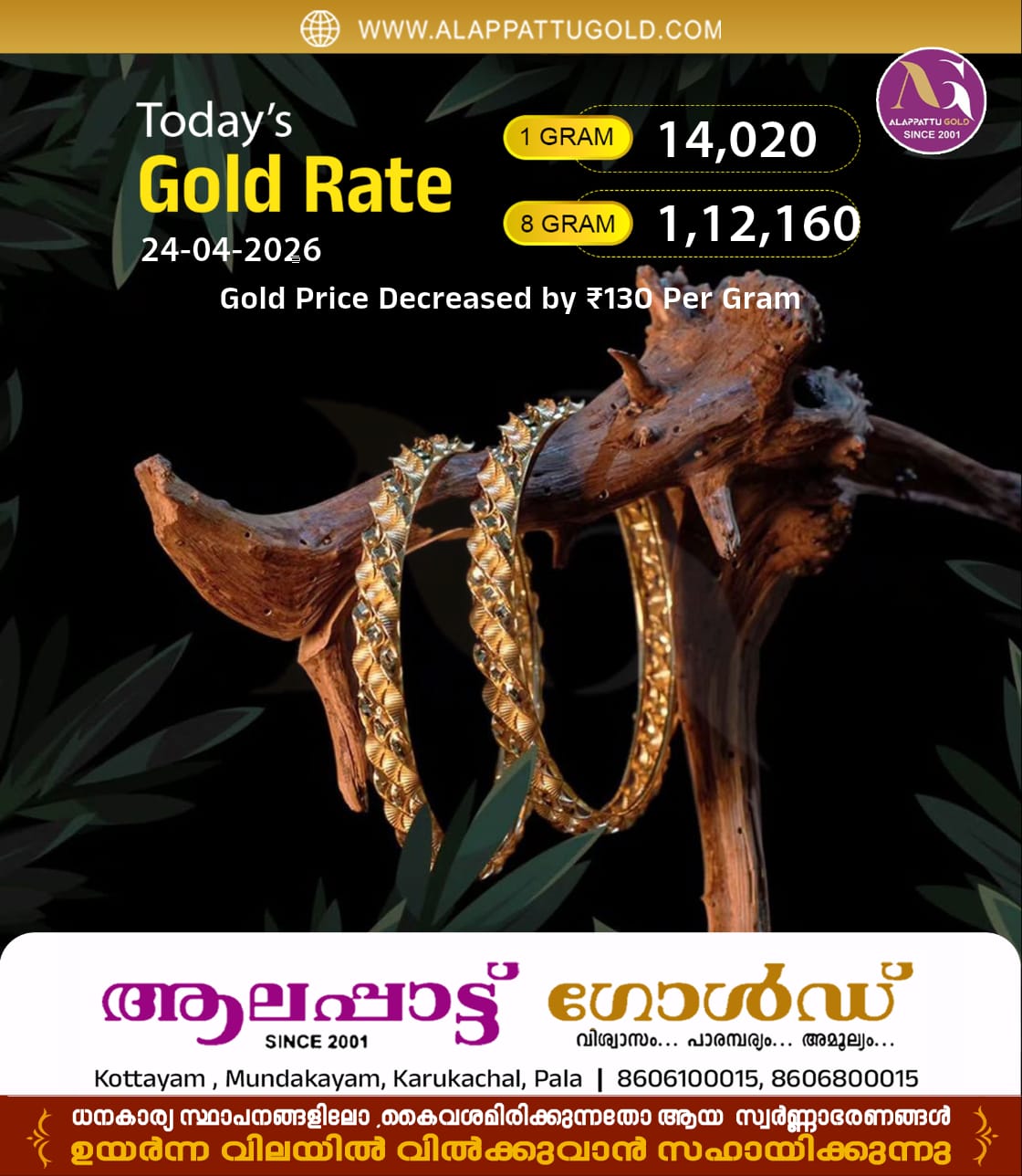 സംസ്ഥാനത്ത് സ്വര്‍ണ വിലയില്‍ വീണ്ടും കുറവ്. പവന് 1040 രൂപയാണ് ഇന്നു താഴ്ന്നത്. ഒരു പവന്‍ സ്വര്‍ണത്തിന്റെ വില 1,12,160 രൂപ. ഗ്രാമിന് 130 രൂപ കുറഞ്ഞ് 14,020 ആയി.