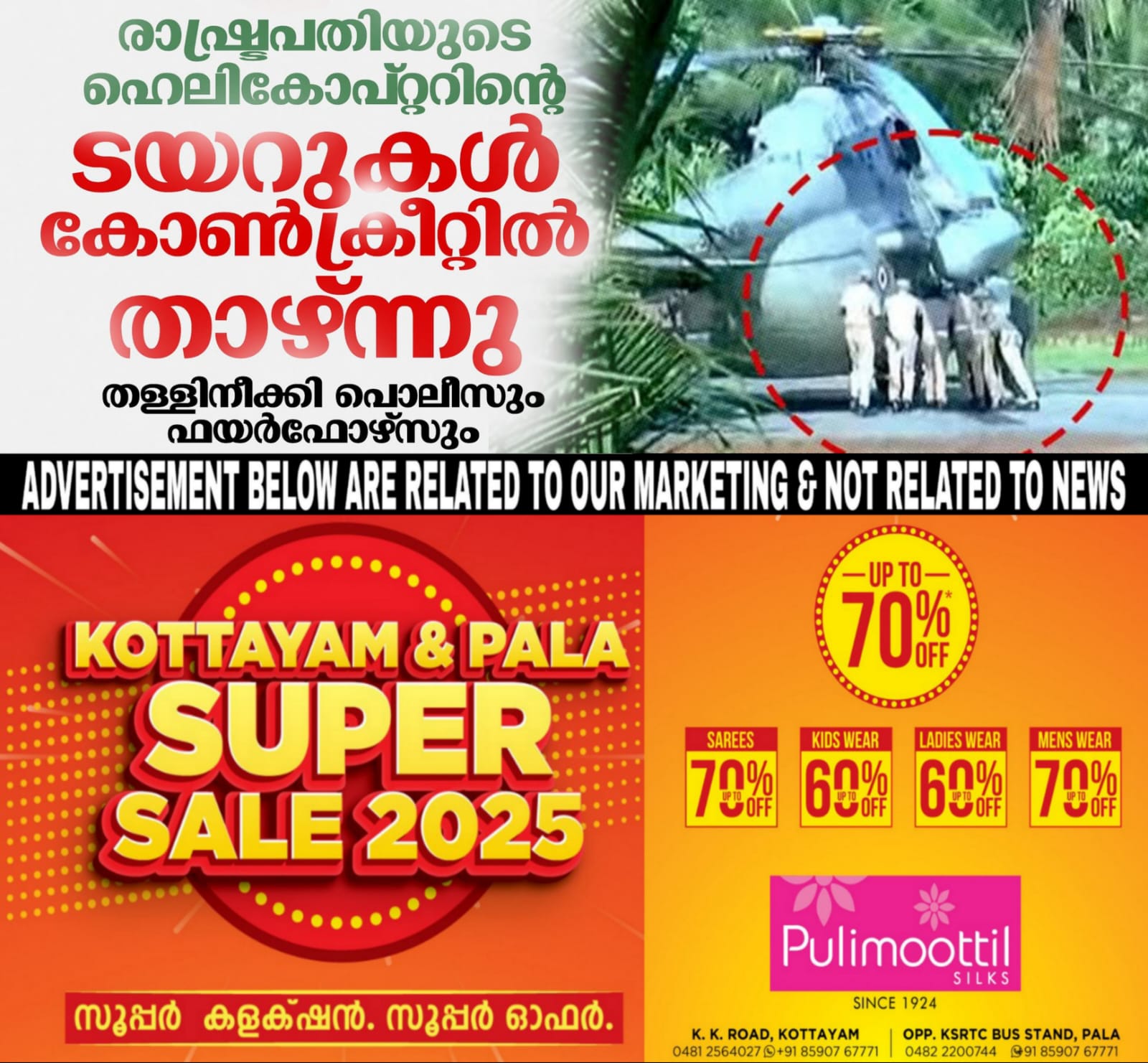 ശബരിമല ദർശനത്തിനെത്തിയ രാഷ്ട്രപതി ദ്രൗപതി മുർമു സഞ്ചരിച്ച ഹെലികോപ്റ്റർ ഇറങ്ങിയ സ്ഥലത്തെ കോൺക്രീറ്റ് തറ താഴ്ന്നുപോയി. പത്തനംതിട്ടയിലെ കോന്നി പ്രമാടം ഇൻഡോർ സ്റ്റേഡിയത്തിൽ ഒരുക്കിയ ഹെലിപാഡിലാണ് സംഭവം. ഹെലികോപ്റ്ററിൻ്റെ ടയറുകൾ കോൺക്രീറ്റിൽ താഴ്ന്നുപോവുകയായിരുന്നു. തുടർന്ന് പോലീസും ഫയർഫോഴ്സും ചേർന്ന് ഹെലികോപ്റ്റർ തള്ളി നീക്കി.