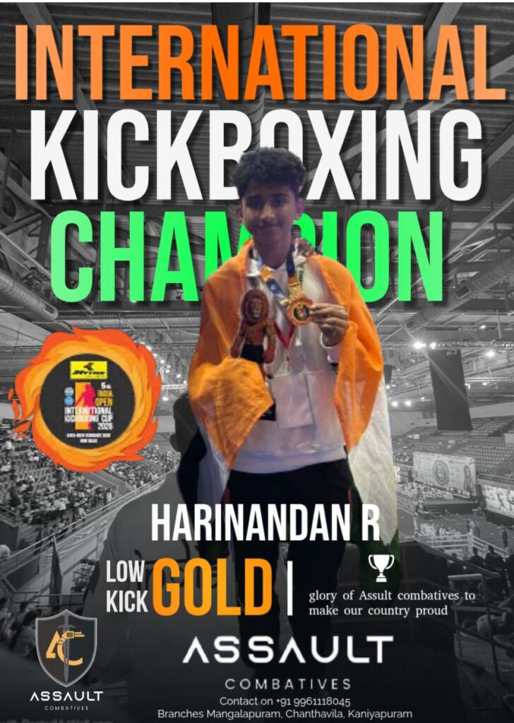 -51 കിലോഗ്രാം വിഭാഗത്തിൽ നടന്ന പോരാട്ടത്തിൽ സാങ്കേതിക തികവും വേഗതയും ഒത്തിണങ്ങിയ പോരാട്ടത്തിലൂടെയാണ് ഹരിനന്ദൻ വിജയം കണ്ടെത്തിയത്. ആയോധനകല പരിശീലകനും ഇൻറർനാഷണൽ കിക്ക് ബോക്സിങ് റഫറിയുമായ ഗിന്നസ് ആദർശിൽ നിന്നുമാണ് കഴിഞ്ഞ നാല് വർഷങ്ങളായി അസോൾട്ട് കോംപാക്ട് മാർഷ്യൽ ആർട്സ് അക്കാദമിയിൽ ആണ് ഹരിനന്ദൻ കിക്ക് ബോക്സിങ്ങും മറ്റ് ആയോധനകലകളും പരിശീലിക്കുന്നത്.