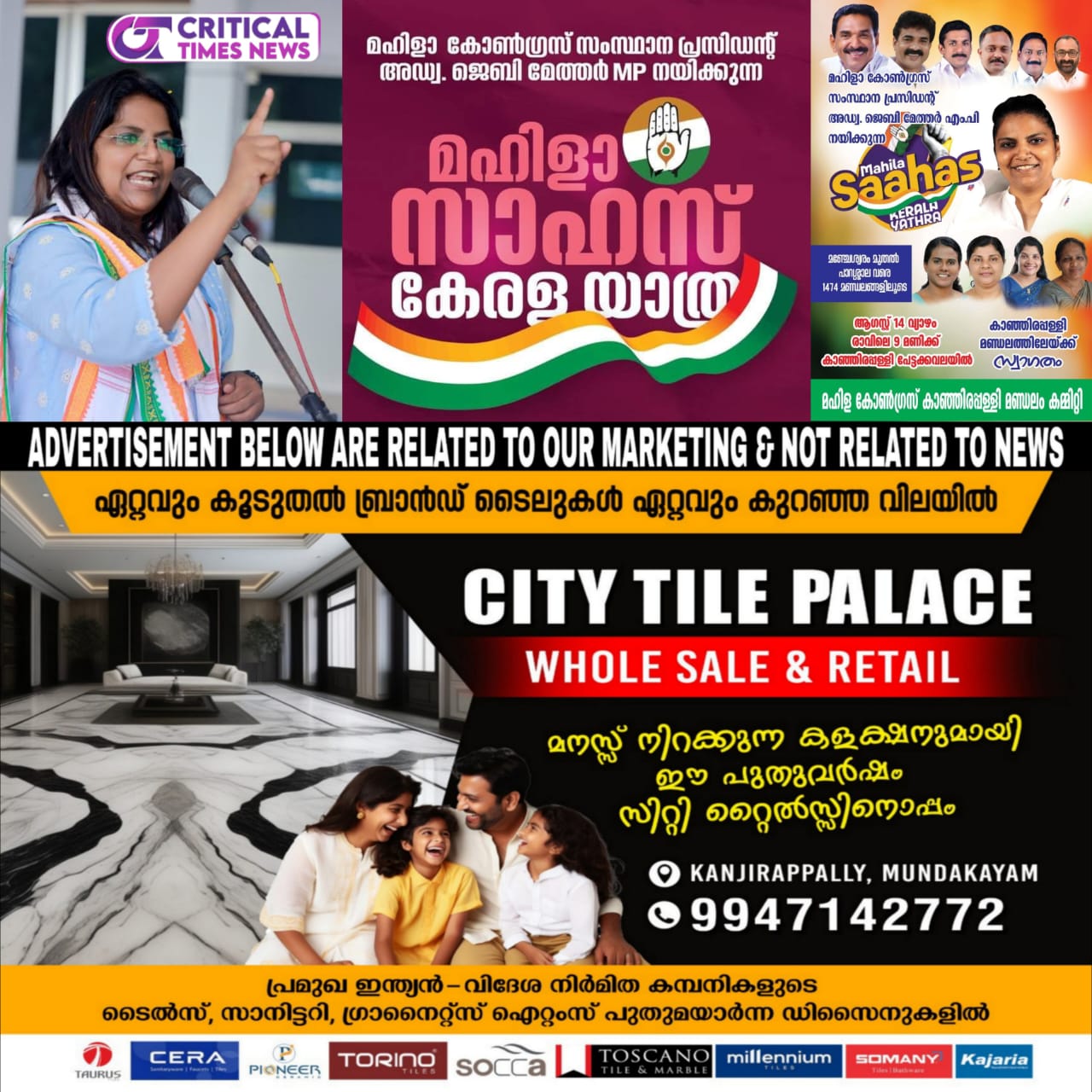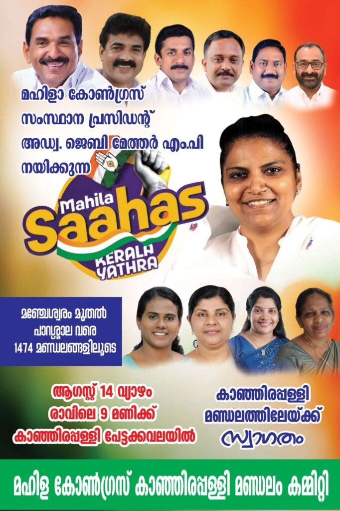 കാഞ്ഞിരപ്പള്ളി: മഹിളാ കോൺഗ്രസ് സംസ്ഥാന പ്രസിഡന്റ് ജെബി മേത്തർ എംപി നയിക്കുന്ന മഹിളാ സാഹസ് യാത്രയ്ക്ക് സ്വീകരണം നൽകുമെന്ന് മഹിളാ കോൺഗ്രസ് കാഞ്ഞിരപ്പള്ളി മണ്ഡലം കമ്മിറ്റി അറിയിച്ചു.