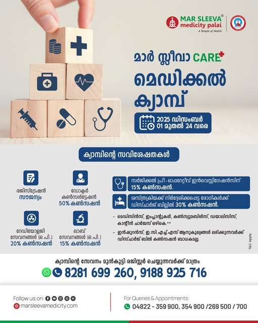 സർജിക്കൽ പ്രീ-ഓപ്പറേറ്റീവ് ഇൻവെസ്റ്റിഗേഷനുകൾക്ക് 15 ശതമാനവും ഡിസ്‌ചാർജ് ബില്ലിൽ 30 ശതമാനവും കുറവുണ്ട്. എല്ലാ സർജറി വിഭാഗങ്ങളിലെയും വിദഗ്ധ ഡോക്ടർമാരുടെ സേവനം ക്യാമ്പിൽ ലഭിക്കും. വിവരങ്ങൾക്കും രജിസ്ട്രേഷനും 9188925716, 8281699260.