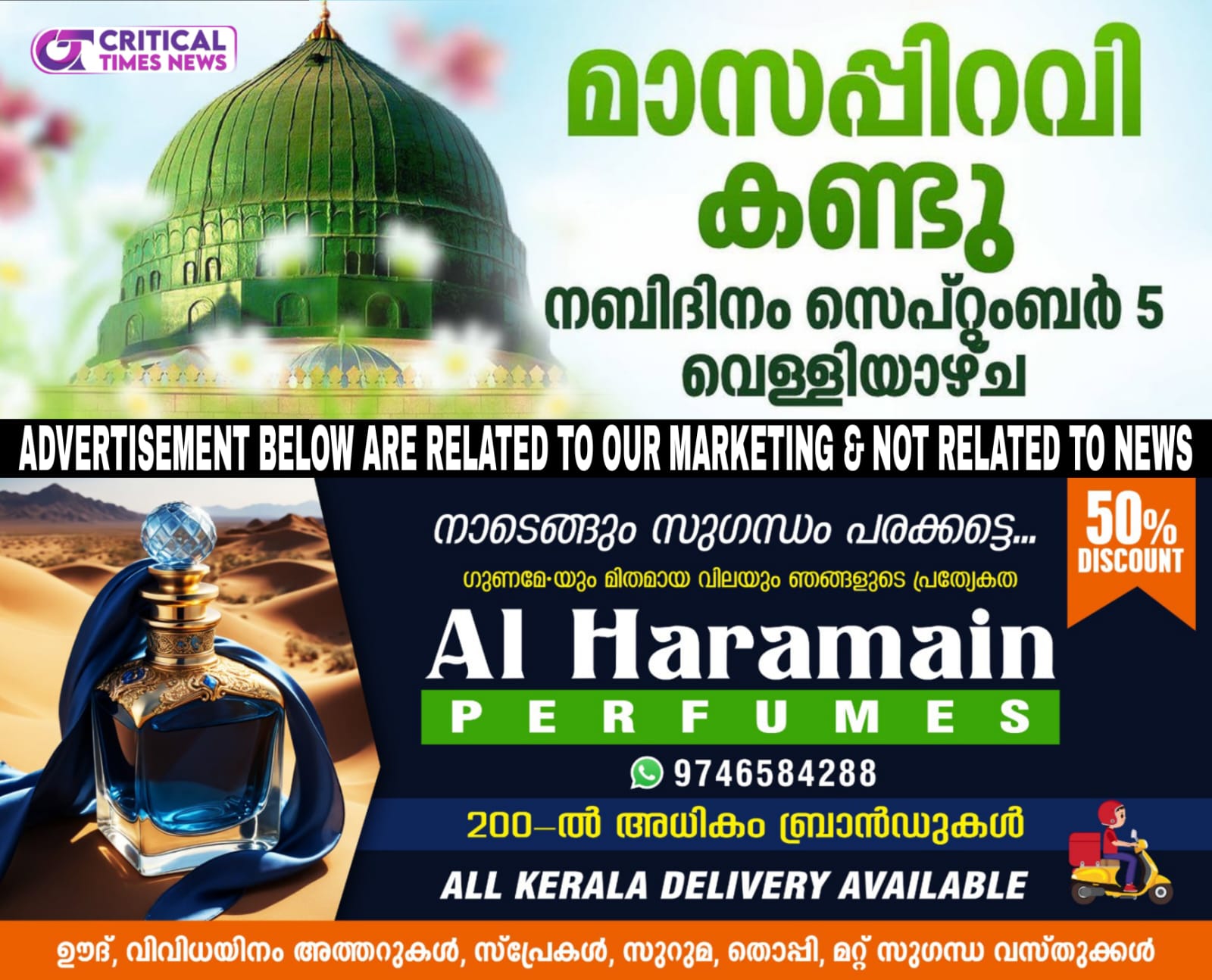 കേരളത്തിൽ നബിദിനം സെപ്റ്റംബർ അഞ്ചിന്. ഇന്ന് റബീഉൽ അവ്വൽ മാസപ്പിറവി കേരളത്തിൽ പലയിടങ്ങളിലും ദൃശ്യമായതിന്റെ അടിസ്ഥാനത്തിലാണ് പ്രഖ്യാപനം. സംയുക്ത ഖാസിമാരായ കാന്തപുരം എ പി അബൂബക്കർ മുസ്ലിയാർ, സയ്യിദ് ഇബ്രാഹിം ഖലീലുൽ ബുഖാരി എന്നിവരാണ് പ്രഖ്യാപനം നടത്തിയത്.