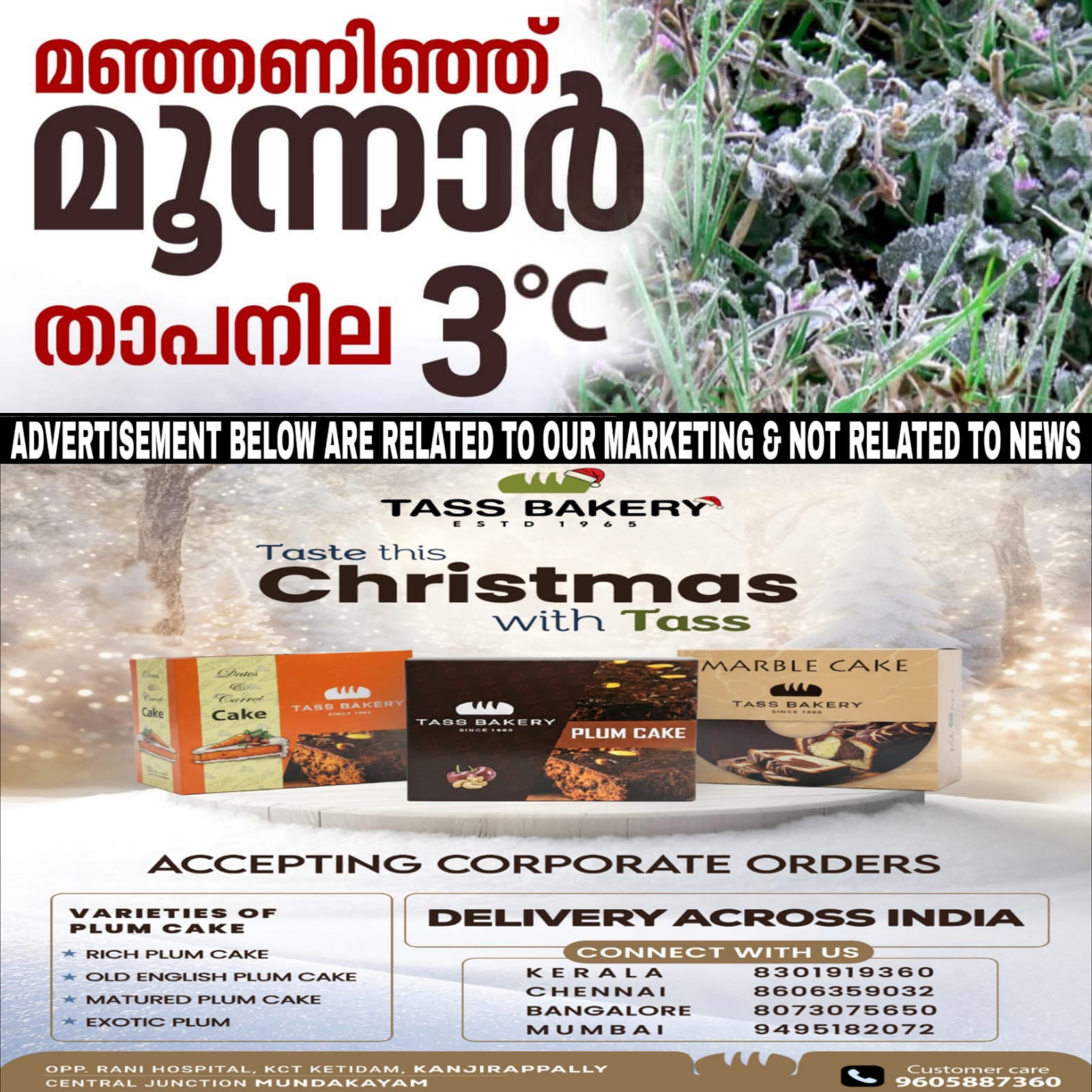 മഞ്ഞണിഞ്ഞ് മൂന്നാര്‍. മൂന്നാറിൽ താപനില 3 ഡിഗ്രിയിലേക്ക് എത്തി.ഈ സീസണിലെ ഏറ്റവും താഴ്ന്ന താപനിയായ മൂന്ന് ഡിഗ്രി സെൽഷ്യസ് കഴിഞ്ഞ ദിവസമാണ് രേഖപ്പെടുത്തിയത്.നല്ലതണ്ണി, തെന്മല, ചിറ്റുവാര, ചെണ്ടുവാര എന്നിവിടങ്ങളിലാണ് താപനില മൂന്ന് ഡിഗ്രിയിലെത്തിയത്.