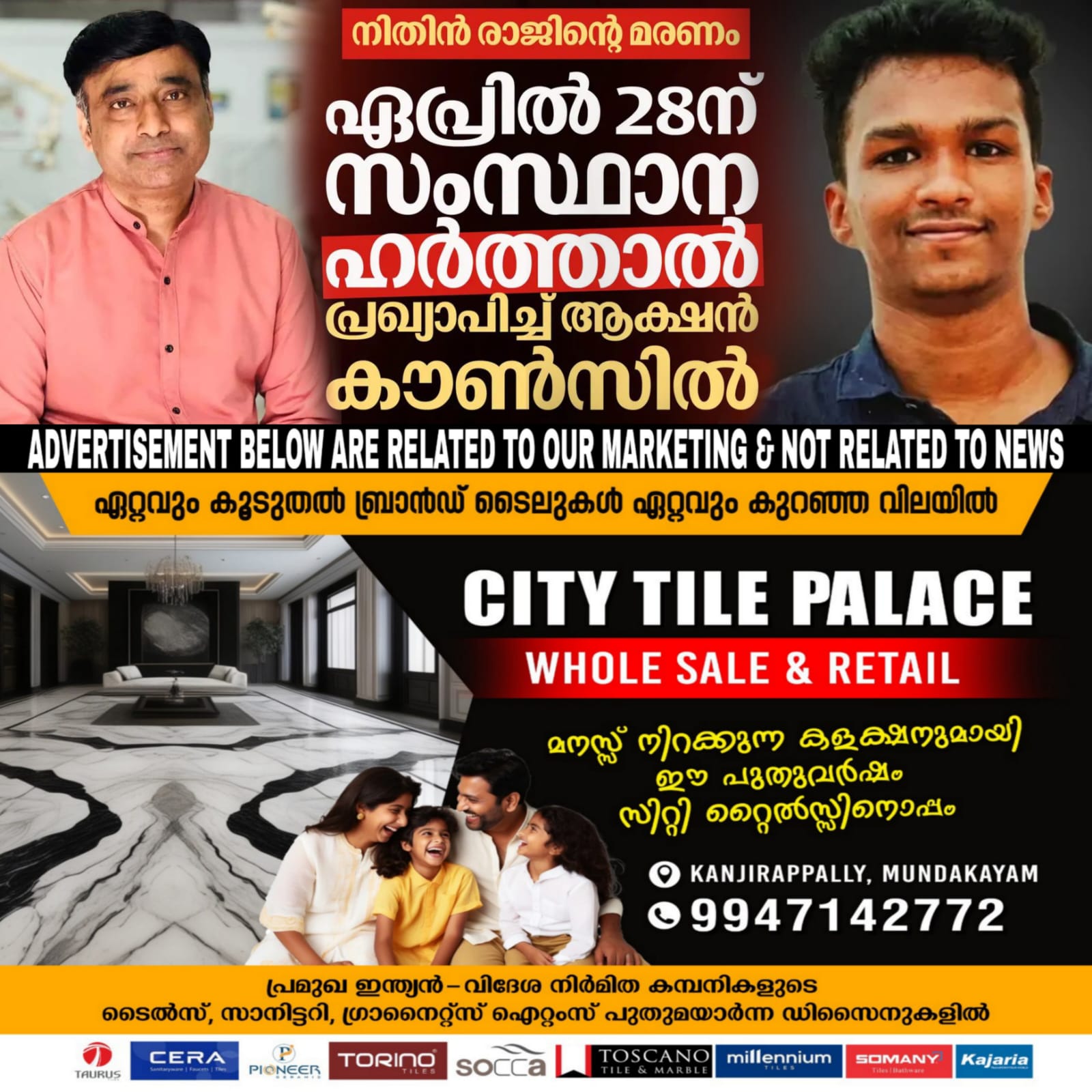 കണ്ണൂര് ഡെന്റല് കോളേജ് ബിഡിഎസ് വിദ്യാര്ത്ഥി നിതിന് രാജിന്റെ മരണത്തിന് ഉത്തരവാദികളായ പ്രതികളെ അറസ്റ്റ് ചെയ്യുന്നില്ലെന്ന് ആരോപിച്ചും ലോണ് ആപ്പിന്റെ മറവില് കേസ് അട്ടിമറിക്കാന് നടത്തുന്നുവെന്നാരോപിച്ചും നിതിന് രാജ് ആക്ഷന് കൗണ്സിലിന്റെ നേതൃത്വത്തില് സംസ്ഥാന ഹര്ത്താല് പ്രഖ്യാപിച്ചു. ഏപ്രില് 28നാണ് ഹര്ത്താല് പ്രഖ്യാപിച്ചിരിക്കുന്നത്.