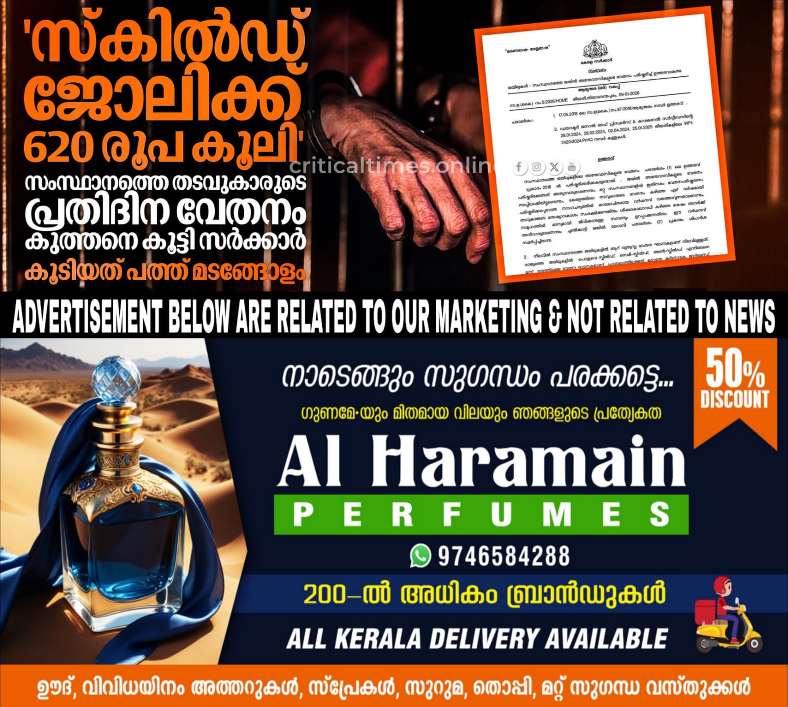 സംസ്ഥാനത്തെ ജയിലുകളിൽ കഴിയുന്ന തടവുപുള്ളികളുടെ കൂലി കുത്തനെ കൂട്ടി സർക്കാർ. പ്രതിദിന വേതനത്തിൽ പത്ത് മടങ്ങ് വരെയാണ് വർധന വരുത്തിയത്. സ്‌കിൽഡ് ജോലികളിൽ ഏർപ്പെടുന്നവർക്ക് 620 രൂപയായിരിക്കും പുതുക്കിയ വേതനം. സെമി സ്‌കിൽഡ് ജോലികളിൽ 560രൂപയും അൺ സ്‌കിൽഡ് ജോലികളിൽ 530 രൂപയുമാണ് പരിഷ്‌കരിച്ച തുക.