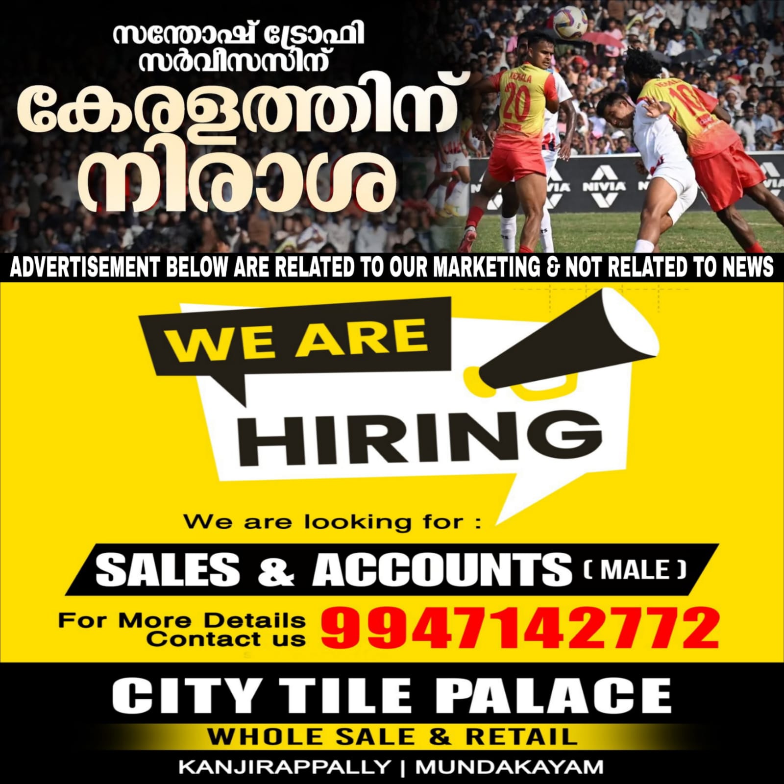 സന്തോഷ് ട്രോഫി എട്ടാം കിരീടം ഉയര്ത്താമെന്ന കേരളത്തിന്റെ മോഹങ്ങള് എക്സ്ട്രാ ടൈമിലെ ഒരൊറ്റ ഗോളില് തകര്ന്നു. ഫൈനലില് സര്വീസസിനെതിരെ എക്സ്ട്രാ ടൈമിലാണ് കേരളം ഗോള് വഴങ്ങിയത്. 109-ാം മിനിറ്റില് അഭിഷേക് പാവാറാണ് സര്വീസസിന്റെ ഗോള് നേടിയത്. സര്വീസസിന്റെ എട്ടാം സന്തോഷ് ട്രോഫി കിരീടമാണിത്. തുടര്ച്ചയായ രണ്ടാം വര്ഷമാണ് ഫൈനലില് കേരളത്തിന് കണ്ണീരോടെ മടങ്ങേണ്ടി വരുന്നത്. കഴിഞ്ഞ വര്ഷം ബംഗാളിനോടും കേരളം തോറ്റിരുന്നു.