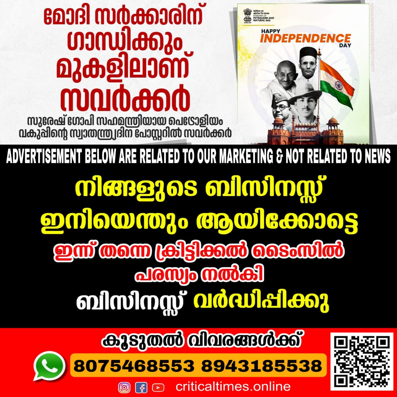 സുരേഷ് ഗോപി സഹമന്ത്രിയായ പെട്രോളിയം മന്ത്രാലയത്തിന്റെ സ്വാതന്ത്ര്യ ദിന പോസ്റ്റർ വിവാദത്തിൽ. മഹാത്മാ ഗാന്ധിക്ക് മുകളിൽ സവർക്കർ എന്ന രീതിയിലാണ് പോസ്റ്റർ ഡിസൈൻ ചെയ്തിരിക്കുന്നത്. സംഭവത്തിൽ വിമർശനം ശക്തമാകുകയാണ്. പെട്രോളിയം മന്ത്രാലയത്തിന്റെ ട്വിറ്റര് പേജിലാണ് ചിത്രം പങ്കുവെച്ചിരിക്കുന്നത്. ഗാന്ധിജി, സുഭാഷ് ചന്ദ്രബോസ്, ഭഗത് സിംഗ്, സവര്ക്കര് എന്നിവരാണ് പോസ്റ്ററിലുള്ളത്.