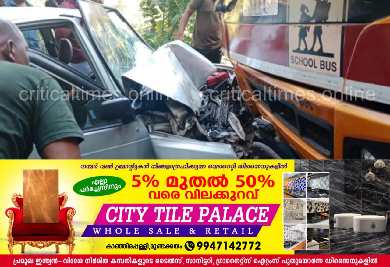 മുണ്ടക്കയത്ത് പ്രവർത്തിക്കുന്ന സ്വകാര്യ സ്കൂളിന്റെ ബസ്സാണ് അപകടത്തിൽപെട്ടത്. വിദ്യാർഥികളെ കൂടാതെ അപകടത്തിൽ കാർ യാത്രക്കാരായ രണ്ടുപേർക്കും പരിക്കേറ്റു. ഇവരെ മുണ്ടക്കയത്തെ സ്വകാര്യ ആശുപത്രിയിൽ പ്രവേശിപ്പിച്ചു. ആരുടെയും പരിക്ക് ഗുരുതരമല്ല.