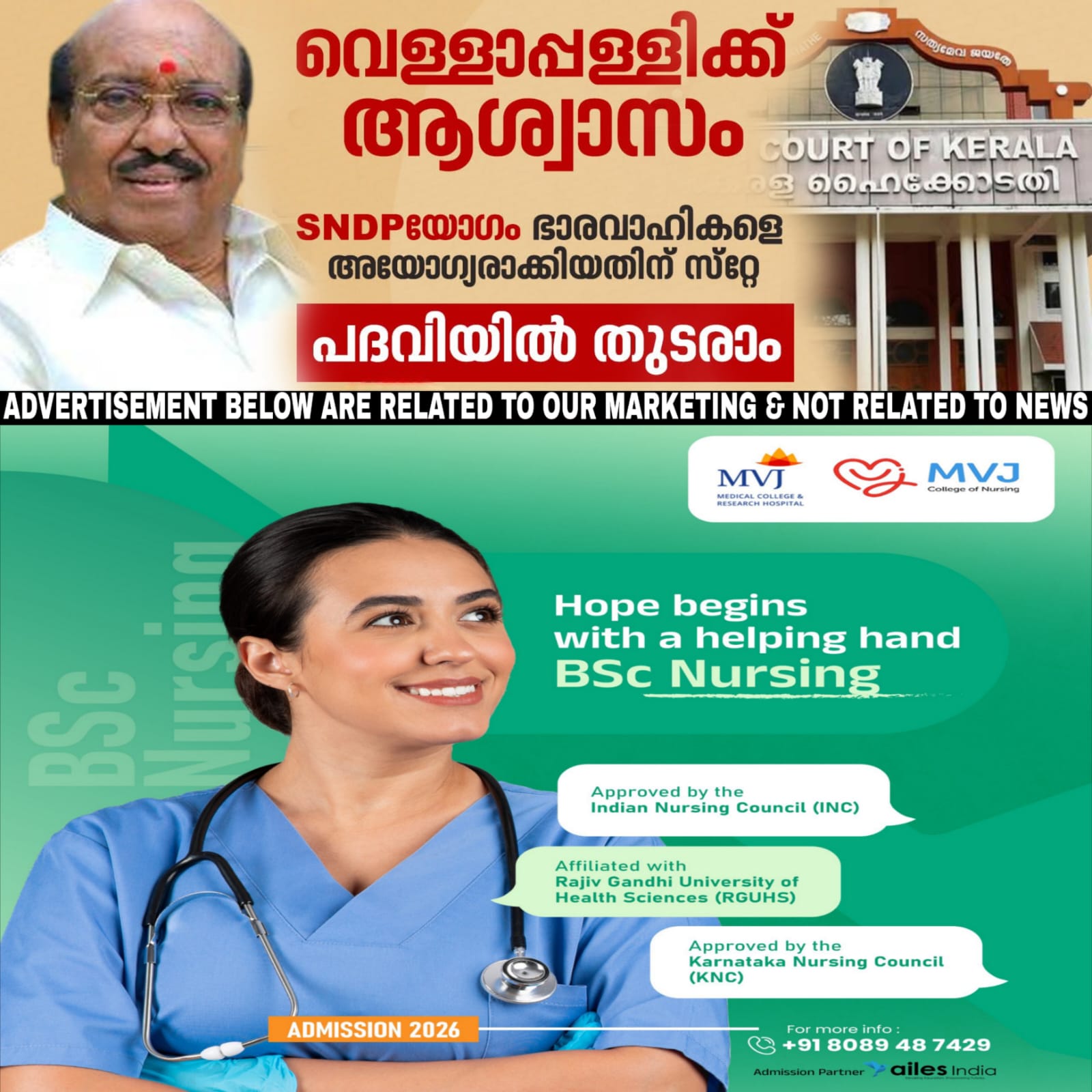 വെള്ളാപ്പള്ളി നടേശന് ആശ്വാസം. SNDP യോഗം ജനറൽ സെക്രട്ടറി സ്ഥാനത്ത് നിന്നും അയോഗ്യനാക്കിയ ഉത്തരവിന് സ്റ്റേ. ഹൈക്കോടതി ഡിവിഷൻ ബെഞ്ചാണ് ഉത്തരവ് സ്റ്റേ ചെയ്തത്. തന്നെ അയോഗ്യനാക്കിയ ഹൈക്കോടതി സിംഗിള് ബെഞ്ച് ഉത്തരവിനെതിരെ വെള്ളാപ്പള്ളി നടേശന് സമർപ്പിച്ച ഹർജിയിൽ ഇന്നാണ് ഹൈക്കോടതി ഇടപെടൽ ഉണ്ടായത്. സിംഗിള് ബെഞ്ച് ഉത്തരവ് സ്റ്റേ ചെയ്യണമെന്ന് ആവശ്യപ്പെട്ട് വെള്ളാപ്പള്ളി നടേശന് സമര്പ്പിച്ച ഹര്ജിയിലാണ് വിധി. ഹര്ജിയില് കോടതി സര്ക്കാരിന്റെ നിലപാട് തേടി.