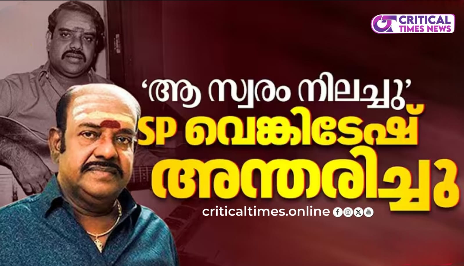 ഗീത സംവിധായകൻ എസ് പി വെങ്കിടേഷ് അന്തരിച്ചു. ചെന്നൈയിലെ വീട്ടിൽ ഹൃദയാഘാതത്തെ തുടർന്ന് ആണ് അന്ത്യം. 70 വയസ്സ് ആയിരുന്നു. 1980 കളിലും 90കളിലും മലയാള സിനിമയിൽ തിളങ്ങി നിന്ന സംഗീത സംവിധായകനായിരുന്നു എസ് പി വെങ്കിടേഷ്. രാവിലെ ശുചിമുറിയിൽ വെച്ച് ഹൃദയാഘാതം അനുഭവപ്പെട്ടതിനെ തുടര്ന്ന് ആശുപത്രിയിലെത്തിച്ചെങ്കിലും ജീവൻ രക്ഷിക്കാൻ സാധിച്ചില്ല.