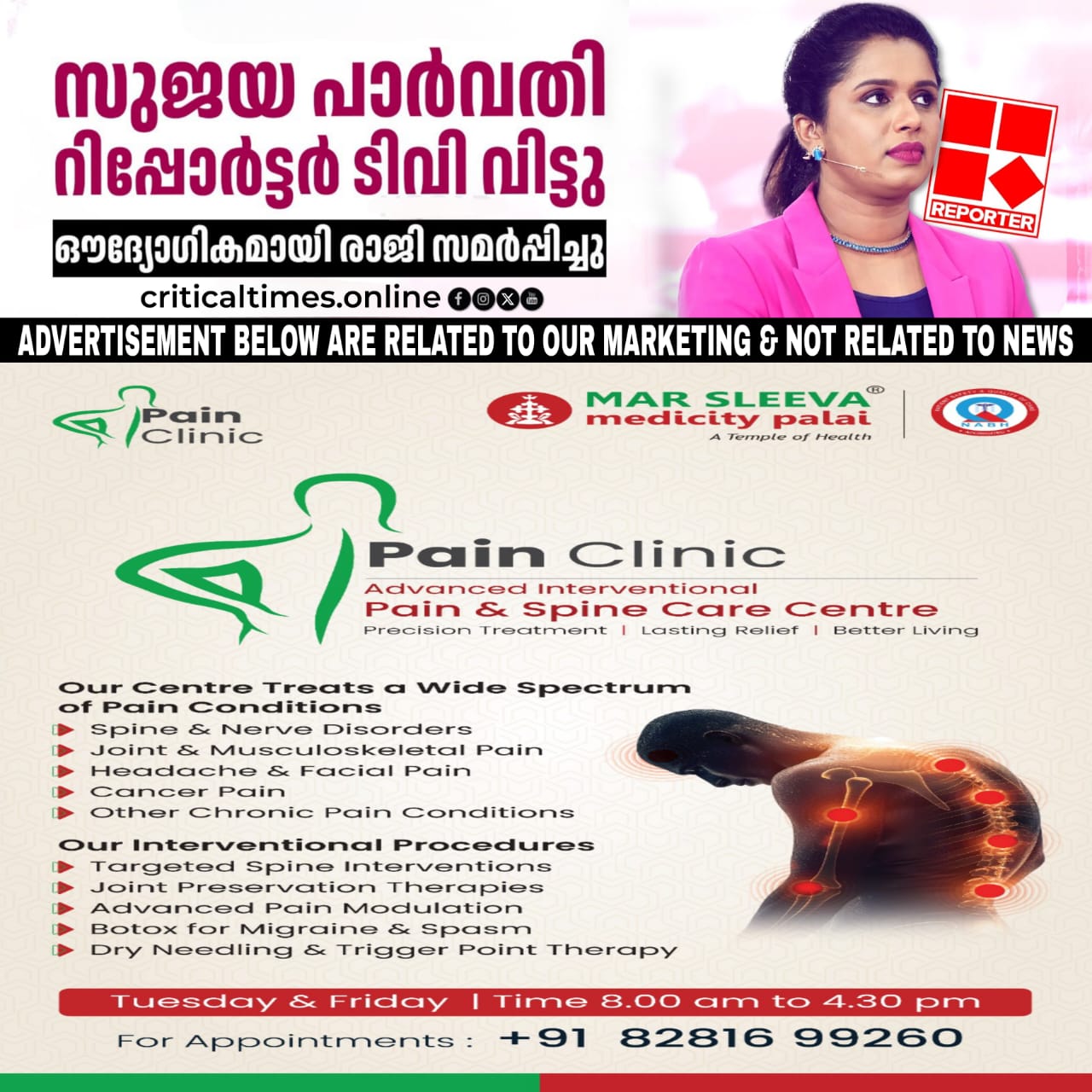 നിലപാടുകൾ കൊണ്ടും, വാർത്താ അവതരണ ശൈലികൊണ്ടും തിളങ്ങി നിന്ന റിപ്പോർട്ടർ ടിവിയിലെ കോ-ഓർഡിനേറ്റിങ്ങ് എഡിറ്റർ സുജയ പാർവതി രാജിവെച്ചു. കഴിഞ്ഞ ഒരാഴ്ചയായി സുജയ അവധിയിലായിരുന്നു. 2023 മുതൽ റിപ്പോർട്ടർ ടിവിയുടെ ഭാഗമായിരുന്നു. നേരത്തെ 24 ന്യൂസ് ചാനലിൽ നിന്നും രാജിവെച്ച ശേഷമാണു റിപ്പോർട്ടറിലേക്ക് എത്തിയത്.