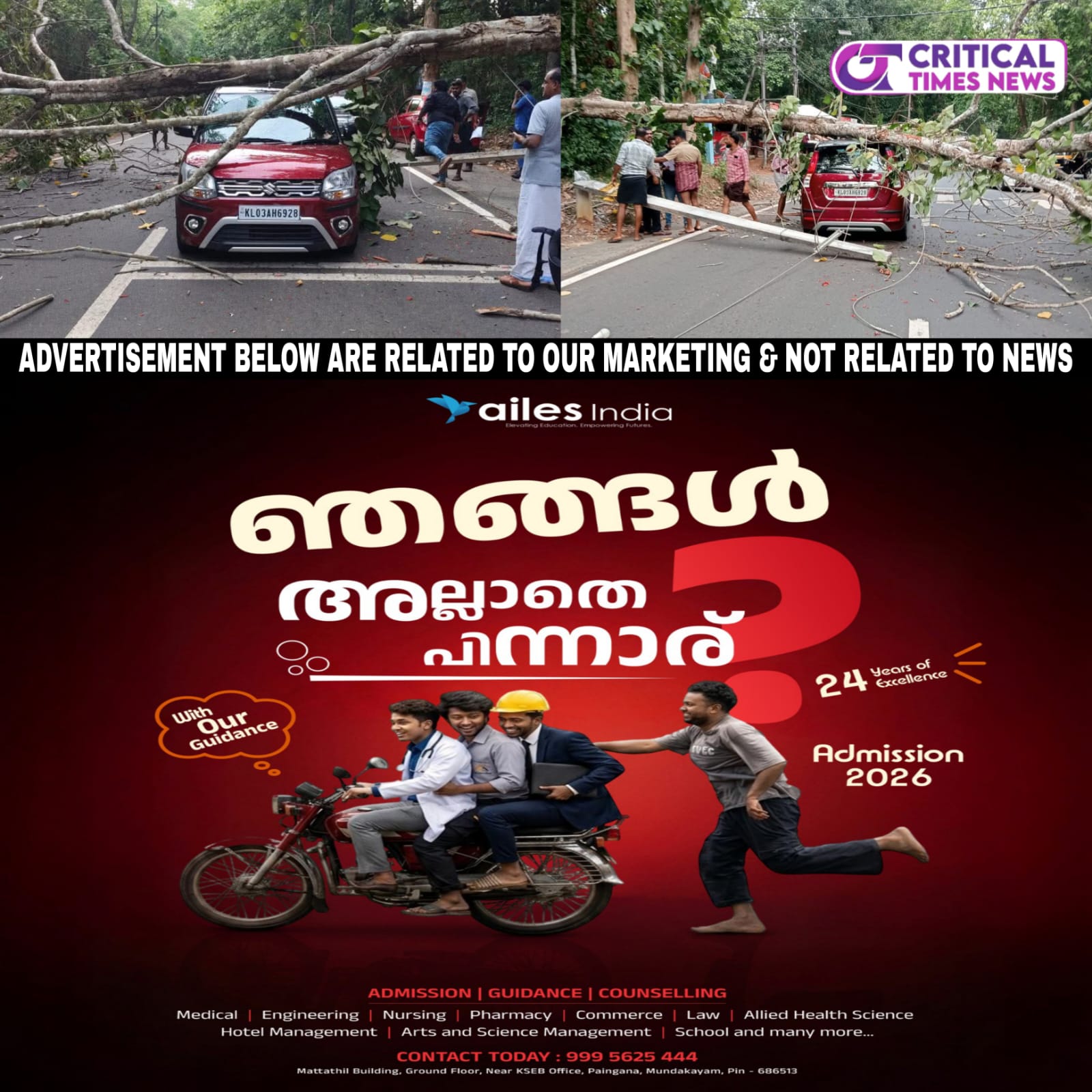 എരുമേലി: എരുമേലി കനകപ്പലത്ത് ഓടിക്കൊണ്ടിരുന്ന കാറിന് മുകളിൽ മരം ഒടിഞ്ഞു വീണു. അപകടത്തിൽ ആർക്കും പരിക്കില്ല. ഇന്ന് ഉച്ചകഴിഞ്ഞായിരുന്നു അപകടം. കനകപ്പലം ജംഗഷനിൽ തന്നെ റോഡരികിലുള്ള വനത്തിലെ മരമാണ് ഒടിഞ്ഞ് വീണത്.