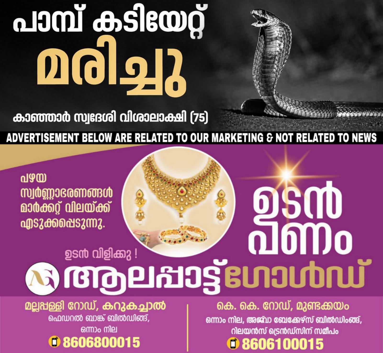 കണ്ണൂര്‍ തളിപ്പറമ്പിലും പാമ്പുകടിയേറ്റ് ഒരു സ്ത്രീ ഇന്ന് മരിച്ചിരുന്നു. 65 കാരിയായ നബീസയാണ് മരിച്ചത്. പരിയാരം മെഡിക്കല്‍ കോളജില്‍ ചികിത്സയിലായിരുന്നു. ഇതോടെ ഒരാഴ്ചയ്ക്കിടെ സംസ്ഥാനത്ത് പാമ്പു കടിയേറ്റ് മരിച്ചവരുടെ എണ്ണം അഞ്ചായി. എറണാകുളം ജില്ലയിലെ ചെറായിയില്‍ റിസോര്‍ട്ടിലെത്തിയ യുവതിക്ക് പാമ്പുകടിയേറ്റു. കടിയേറ്റ കോയമ്പത്തൂര്‍ സ്വദേശിനി ശര്‍മിള ചികിത്സയില്‍ തുടരുകയാണ്.