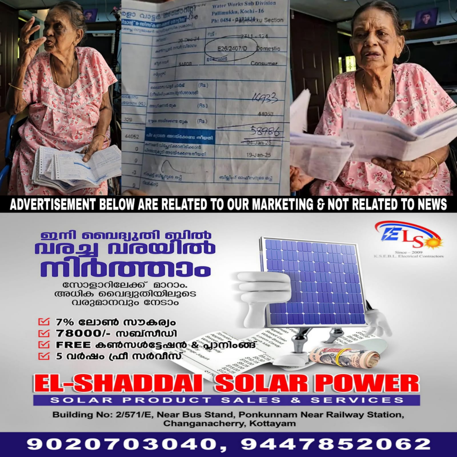 ഇതിന് ശേഷം 2024 ഡിസംബർ 26ന് നല്കിയ ബില്ലിലാണ് ഇത്രയും വലിയ തുക നല്കിയിരിക്കുന്നത്. മുൻ ബില്ല് അഡ്ജസ്റ്റ്മെന്റ് വിഭാഗത്തില് 44052 രൂപയും വാട്ടർ ചാർജില് 14933 രൂപയും ഉള്പ്പെടെ ആകെ 58,986 രൂപയുടെ ബില്ലാണ് നല്കിയിട്ടുള്ളത്. മീറ്ററില് ഒക്ടോബർ 30 ന് രേഖപ്പെടുത്തിയ അതേ റീഡിങ്ങ് തന്നെയാണ് ഡിസംബർ 26നും രേഖപ്പെടുത്തിയിരിക്കുന്നത്.
