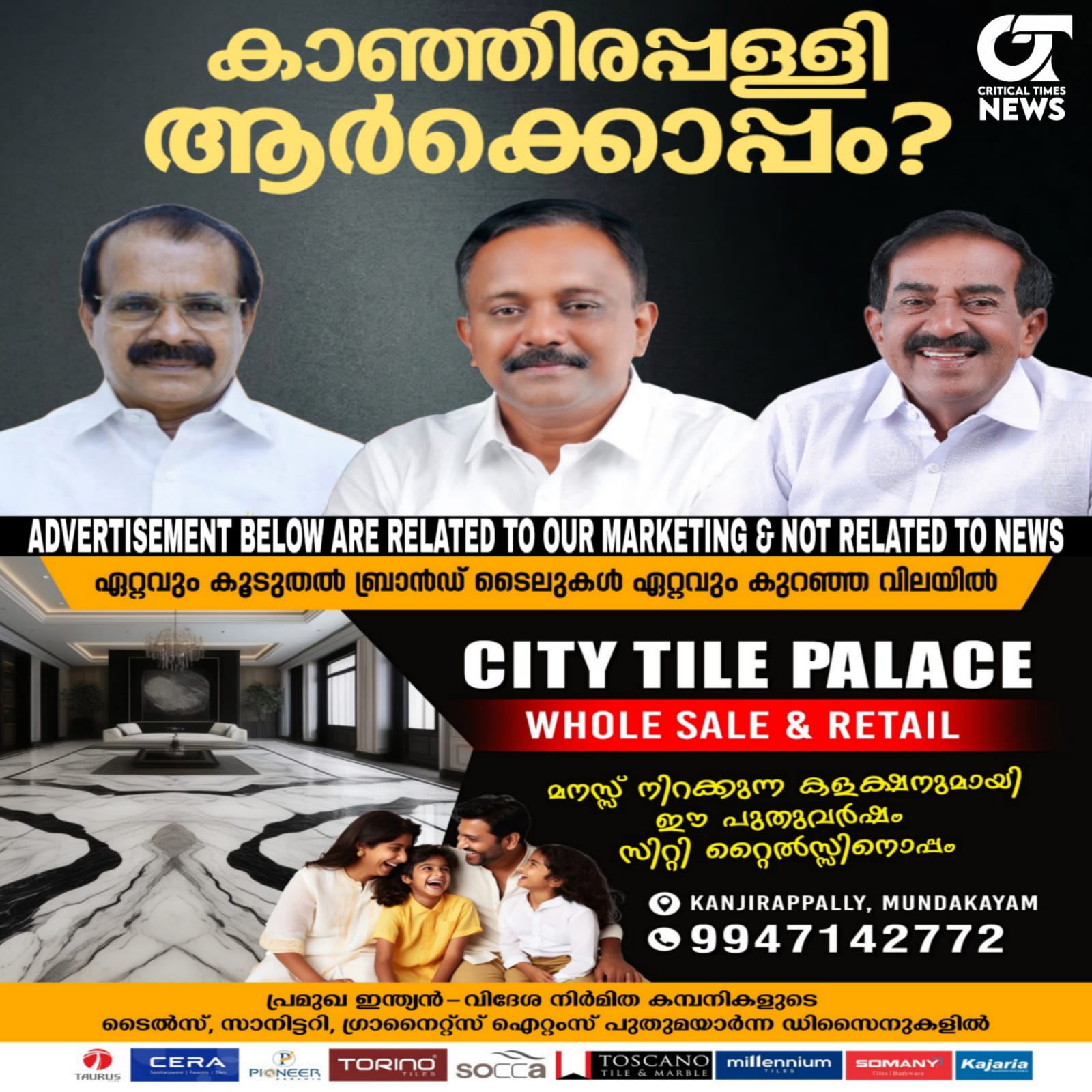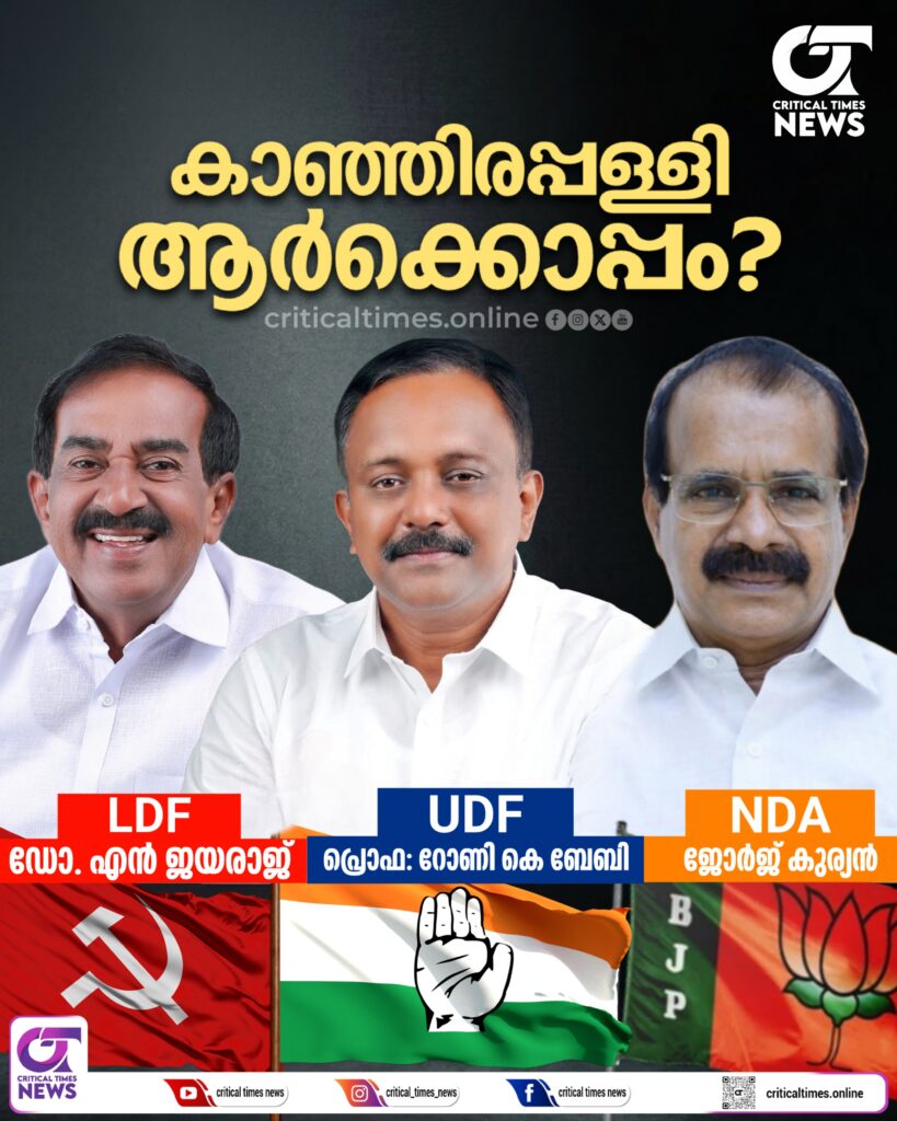 2026 നിയമസഭ തെരഞ്ഞെടുപ്പില് കാഞ്ഞിരപ്പള്ളി നിയോജക മണ്ഡലത്തില് സര്ക്കാര് ചീഫ് വിപ്പ് കൂടിയായ ഡോ. എന്. ജയരാജാണ് കേരള കോണ്ഗ്രസ് മാണി ഗ്രൂപ്പിന്റെ സ്ഥാനാര്ഥി. മണ്ഡലം നിലനിര്ത്താന് ജയരാജ് ഇറങ്ങുമ്പോള് യുഡിഎഫ് പ്രൊഫ. റോണി കെ. ബേബിയെ സ്ഥാനാര്ഥിയാക്കിയിരിക്കുന്നു. നേരത്തെ സൂചിപ്പിച്ചതുപോലെ കേന്ദ്രസഹമന്ത്രി ജോര്ജ് കുര്യനാണ് കാഞ്ഞിരപ്പള്ളിയില് ഇത്തവണ എന്ഡിഎ സ്ഥാനാര്ഥി.